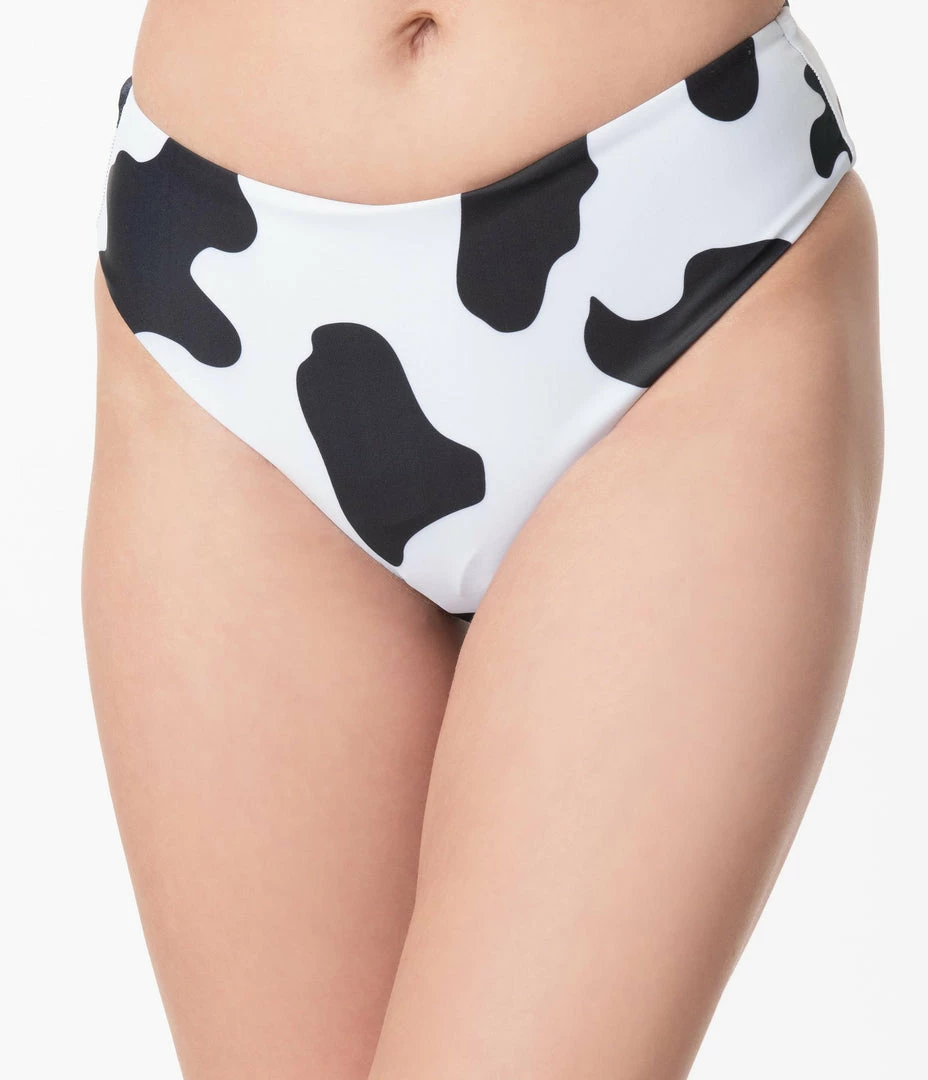 Make your moo-ve! Herd your admirers with this fabulous two piece swimsuit, dancing with a sweet black and white cow print throughout. The retro bikini top features removable padding, lining, and secure shoulder straps while the mid-rise bikini bottom is lined for sweet beach-side posing!