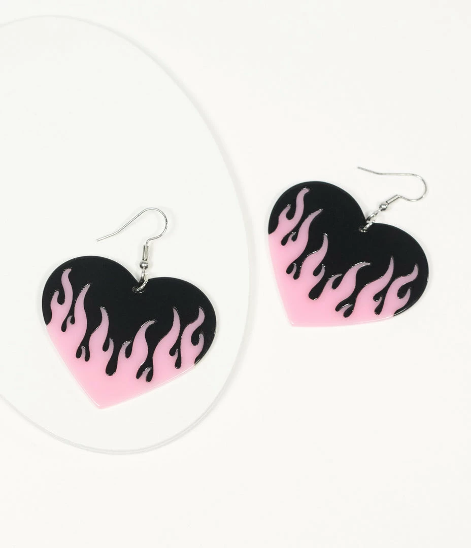 Set hearts afire! These marvelous retro inspired earrings are a lightweight duo, crafted in black and pink acrylic and boasting a fiery flame design. Secured with silver hardware hook backs!