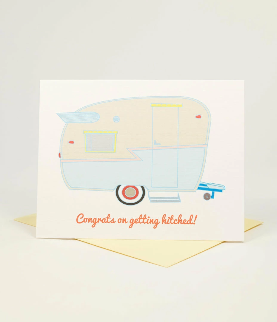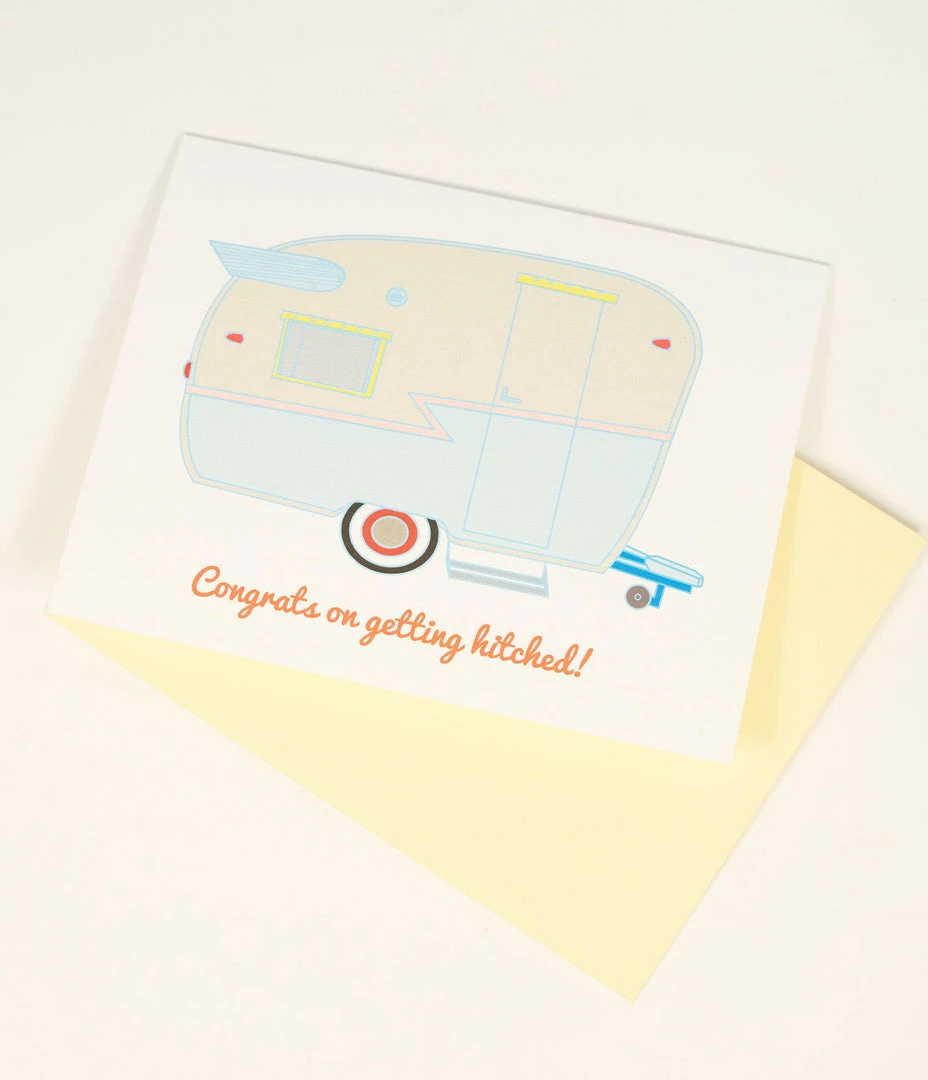 This wedding card features a retro trailer house with the words, ‘Congrats On Getting Hitched!’. Complete with a blank interior and envelope.