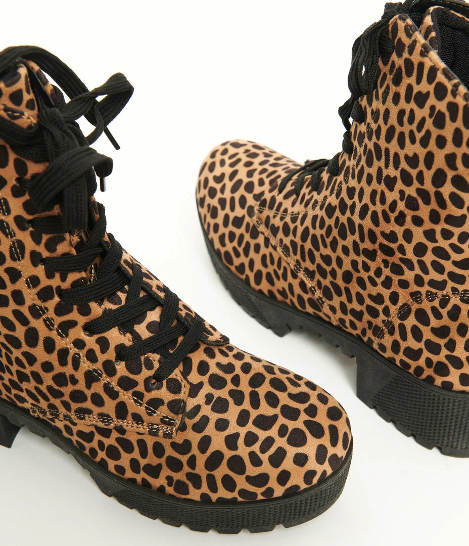 Leave them quaking, gals! These powerful boots are crafted in a fabulous faux suede leopard print, featuring a thick black tread and 1.5 inch platform while the 2 inch heel lends a sturdy lift. Secured with a lace up vamp and a side zipper!
