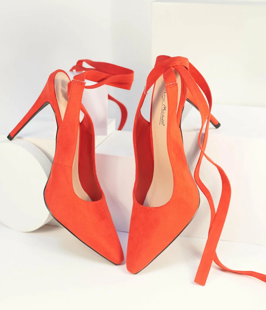 Persuasion looks good on you, dolls! These sultry red heels are crafted in faux suede and eye-catching a pointed toe and dramatic 5 inch stiletto heel. Dual ties provide a marvelous ribbon self tie style around your ankle for romantic frolics!