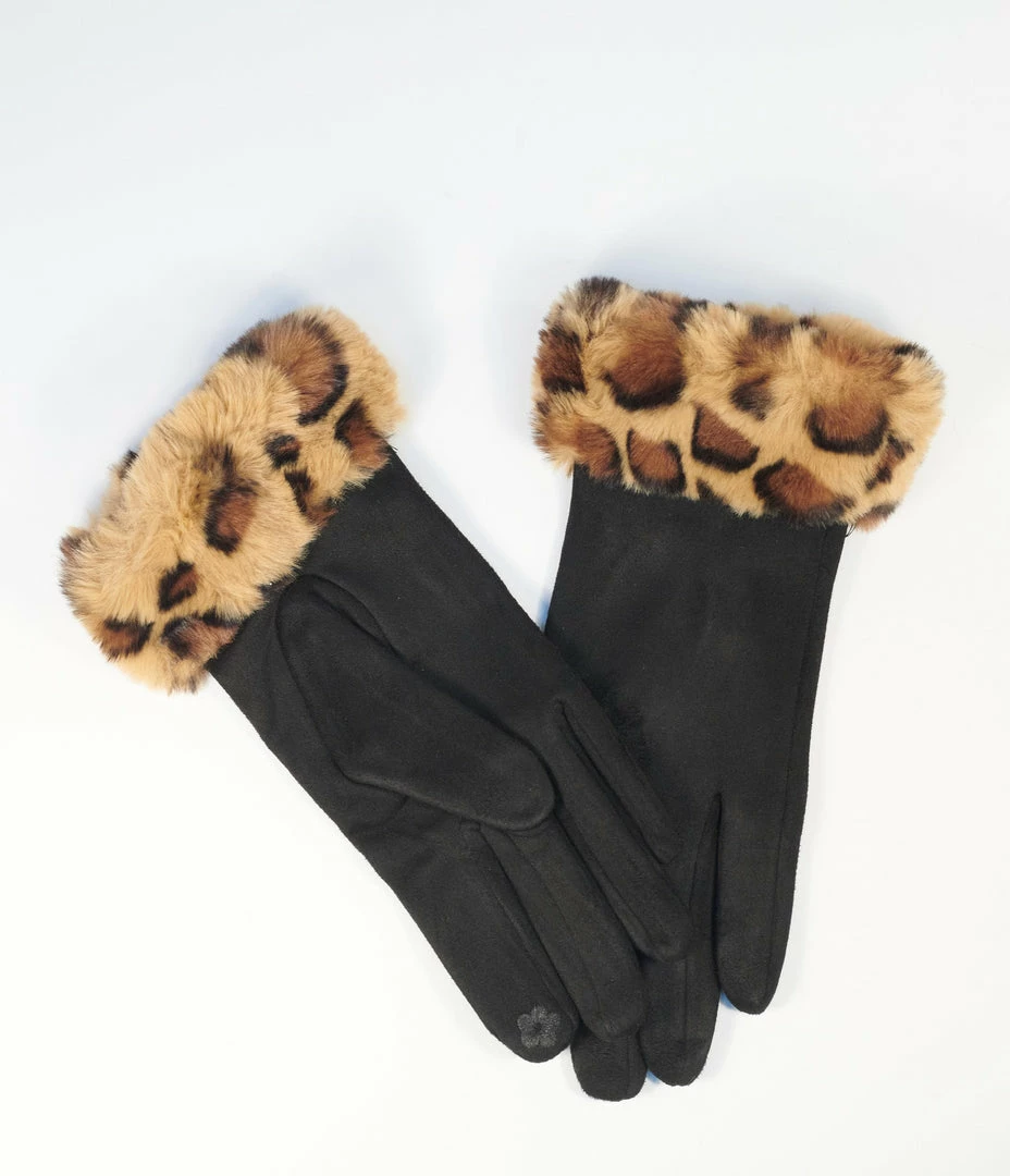 Stay warm out there, dolls! Add enchantment to your winter ensemble with these darling wrist gloves, crafted in a black faux suede and lined with velvet. The leopard print faux fur trim embellishes the wrists while the pointer fingers feature touchscreen capability!