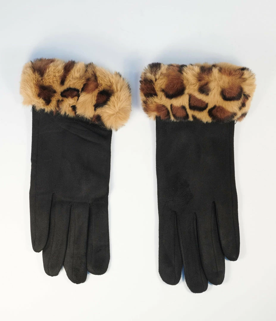 Joia Accessories Black Suede & Leopard Print Fur Trim Gloves