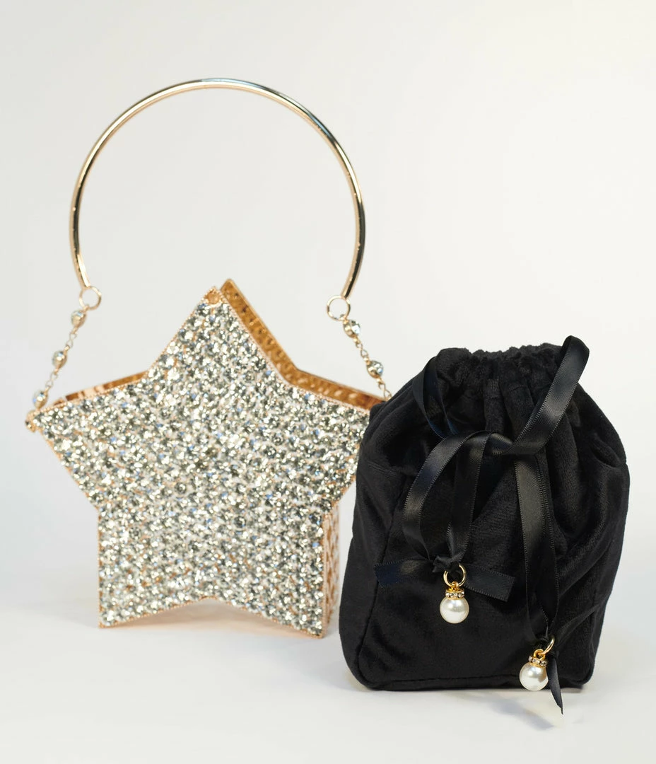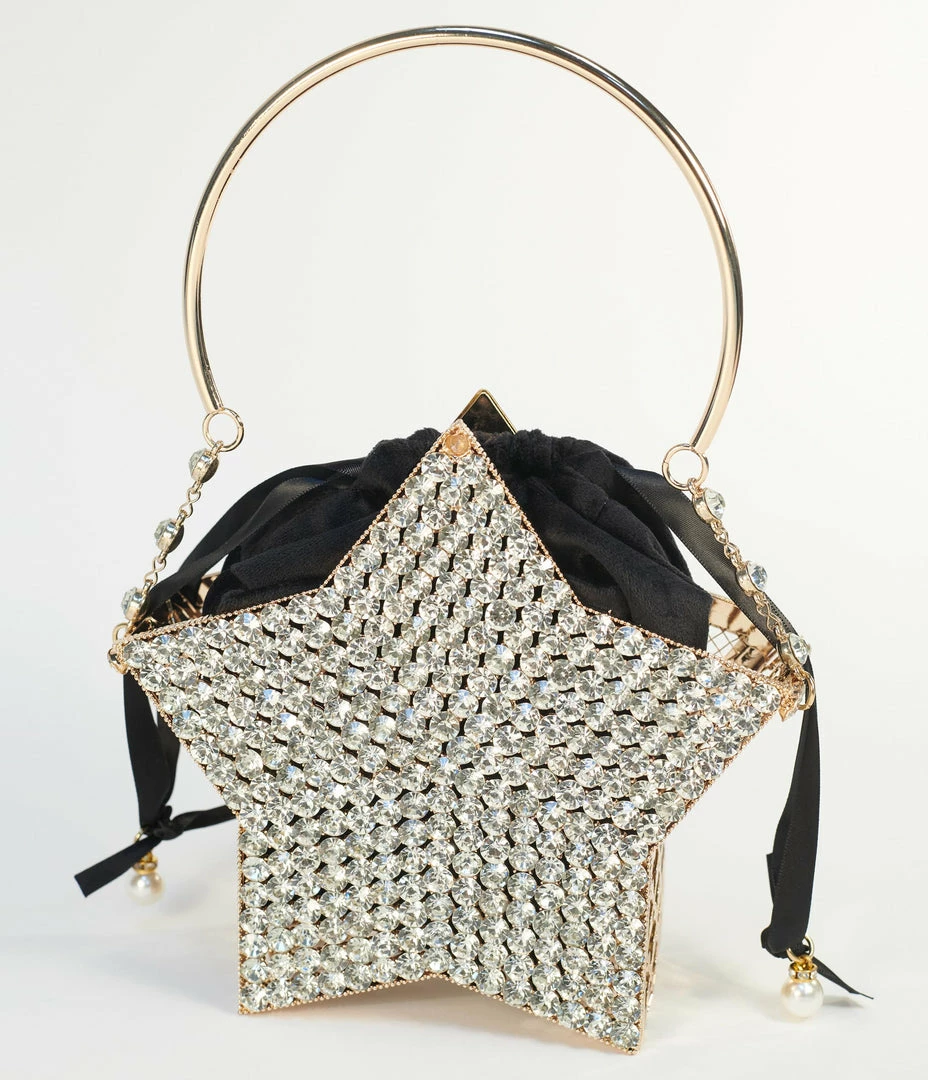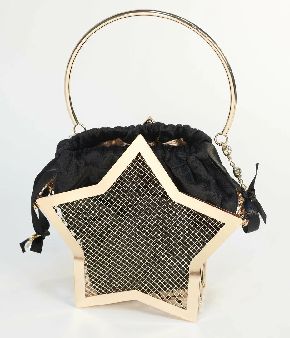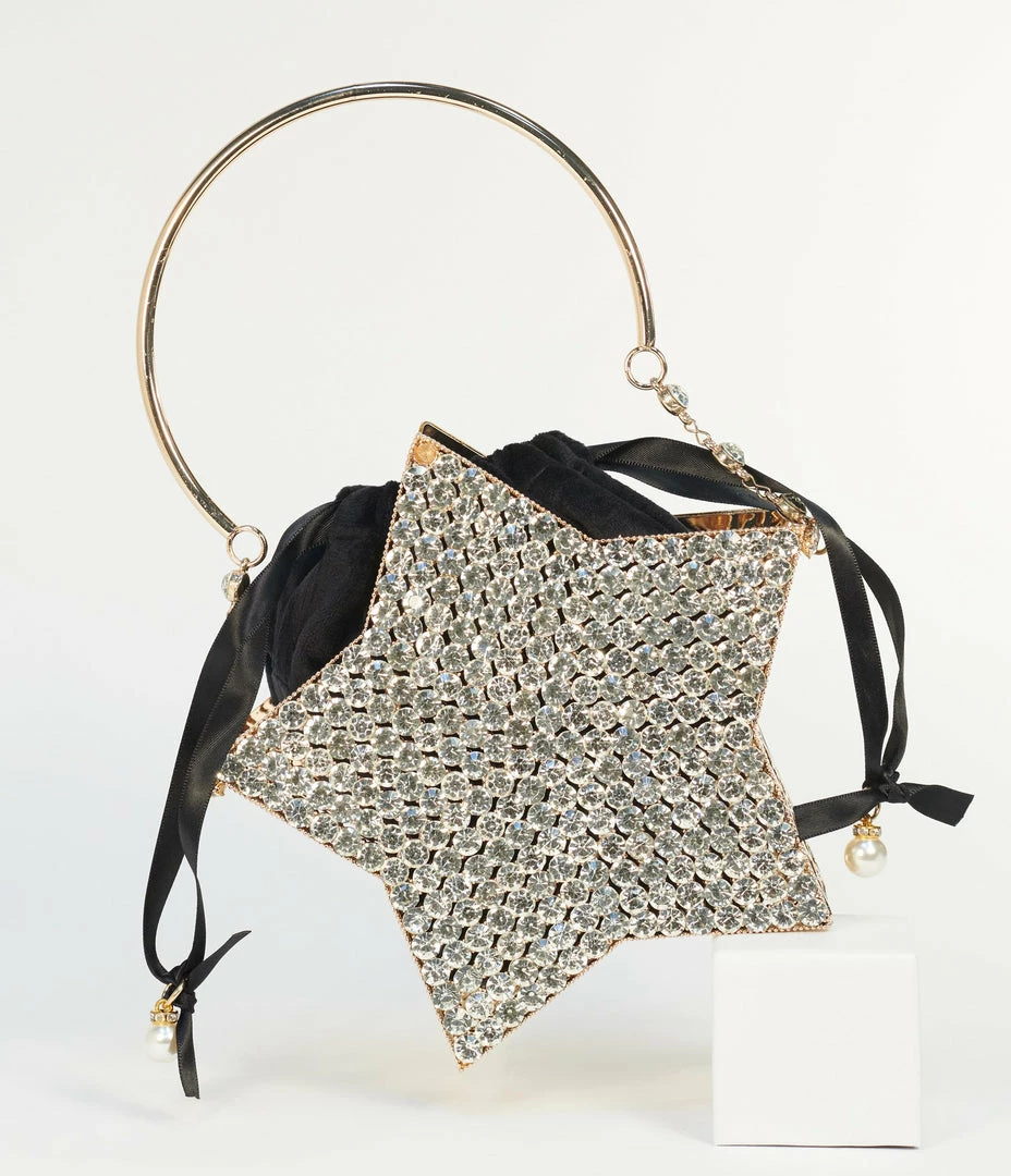Catch a falling star, dames! This ethereal star shaped handbag is crafted in golden mesh hardware with dazzling silver rhinestones. The removable inner black velvet bag boasts a ribbon pull closure accented with faux pearls. Complete with top handle and removable chain link shoulder strap!