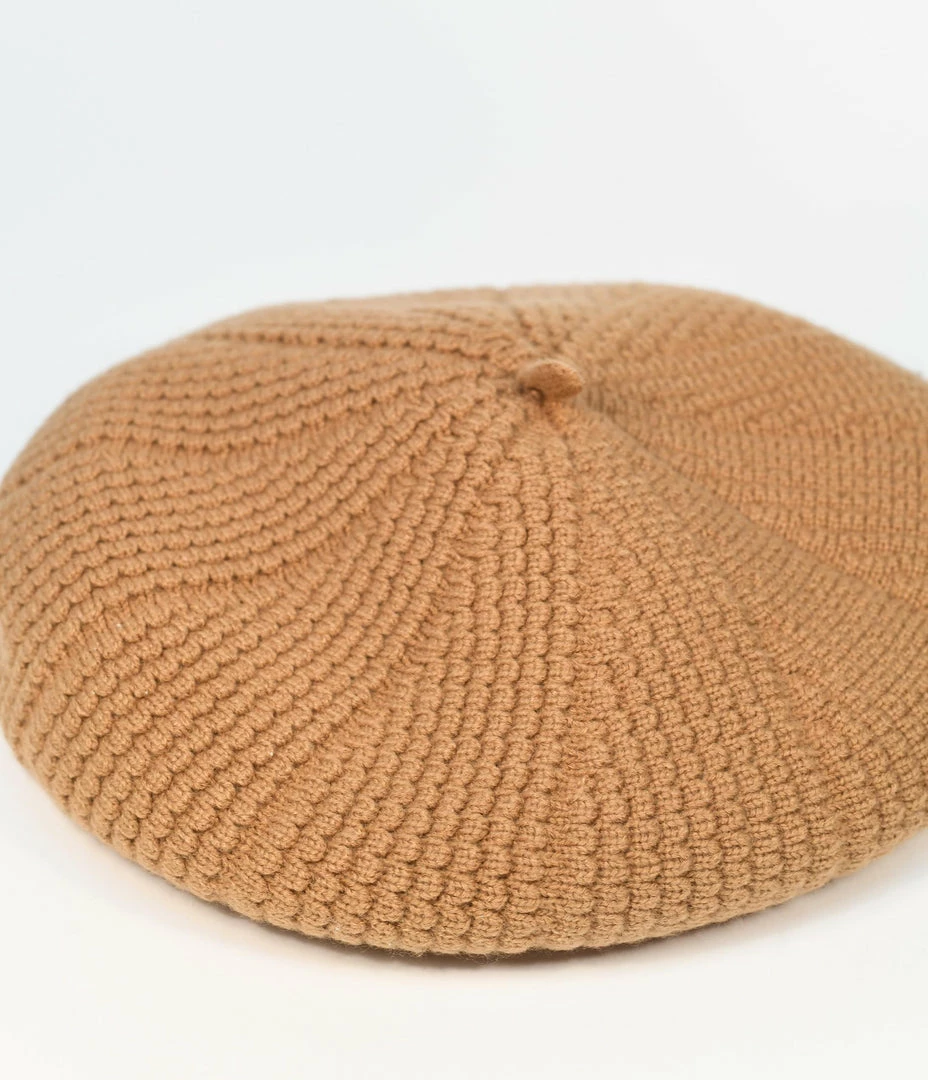 Bid your cares adieu! A warm vintage style beret, this classic accessory is cast in a soft camel brown sweater-like knit and boasts a beautiful texture throughout!