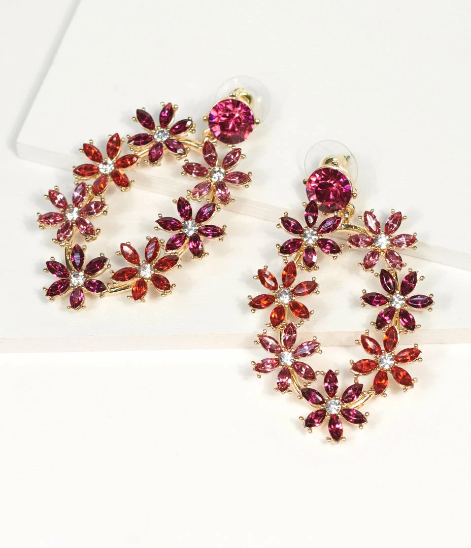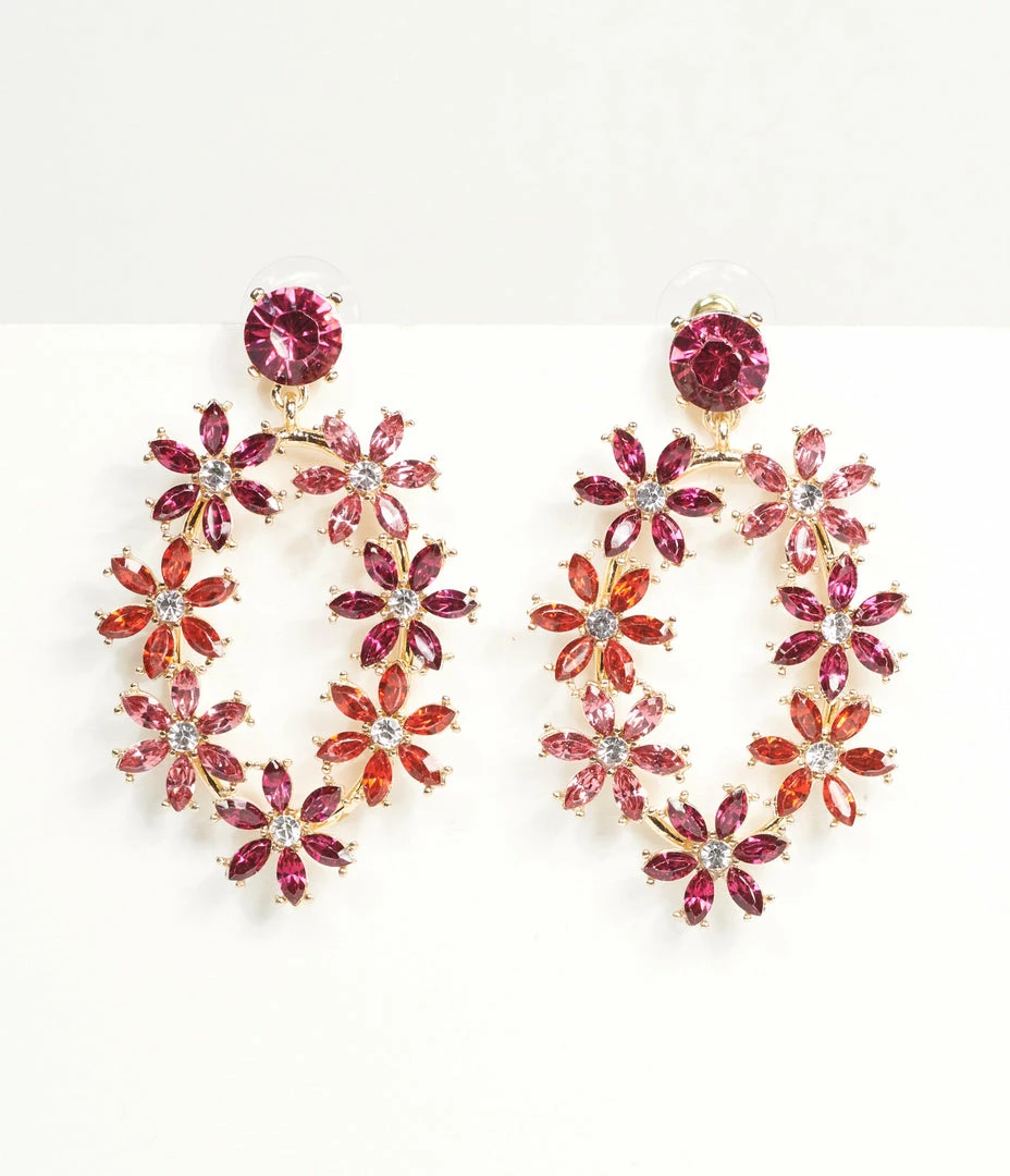 Floral glamour at its finest, darling! This pair of dazzling oval shaped drop earrings boasts an array of rhinestone florals in shades of pink and red and secured in golden hardware. Complete with post backs for comfortable wear!
