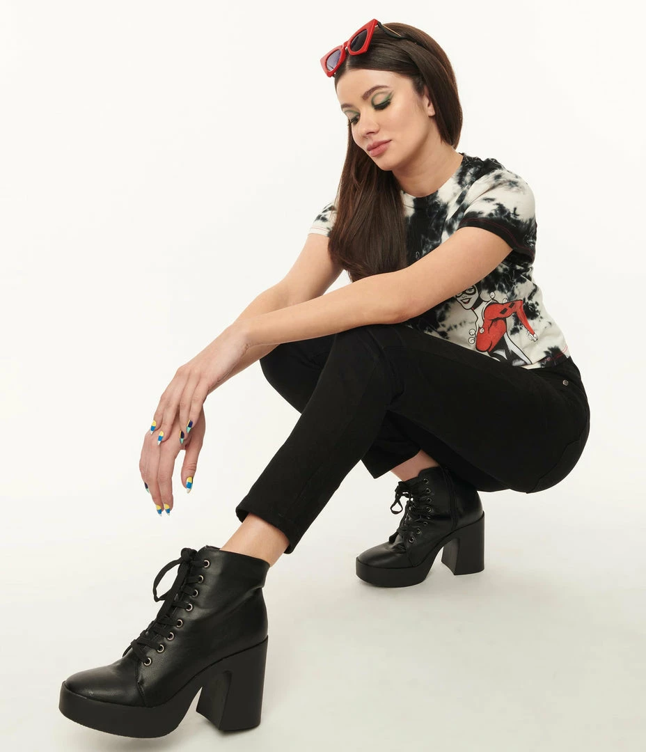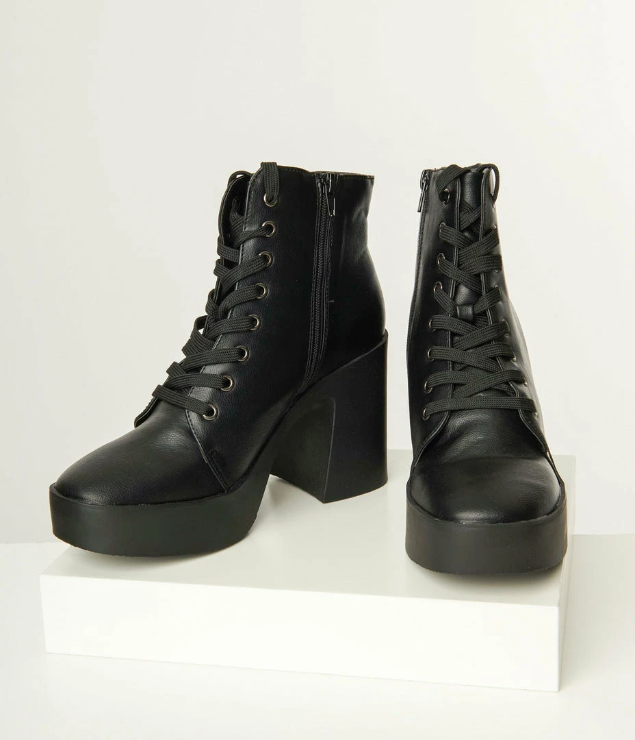 These fabulous ankle boots take your style to the next level in gorgeous black leatherette. Crafted with a cushioned insole and boasting a dramatic 1.5 inch platform and 4 inch heel, these charming kicks are complete with lace up vamp and side zipper for a secure fit!