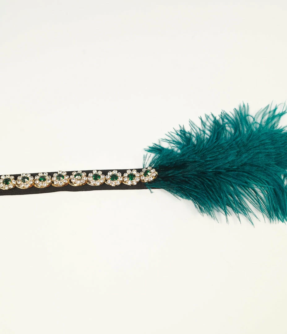 A sparkling headband full of deco divinity, this flapper inspired accessory features a dazzling mix of emerald green and silver rhinestones set in gleaming rose gold hardware. Secured to a black elastic band for a perfect fit, this charming topper boasts a plume of teal feathers on the side!