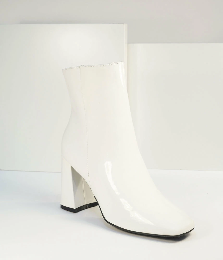Dreaming of dance halls, darling? These stunning ankle boots take your ensemble to the next level in a fabulous white patent leatherette. Crafted with a cushion insole and boasting a 3.5 inch heel, these charming kicks are complete with a side zipper for a secure fit!