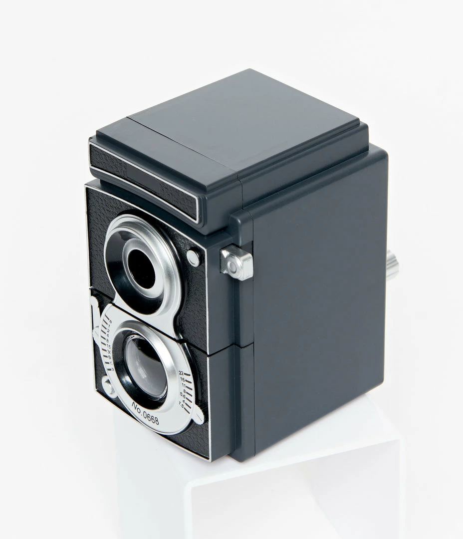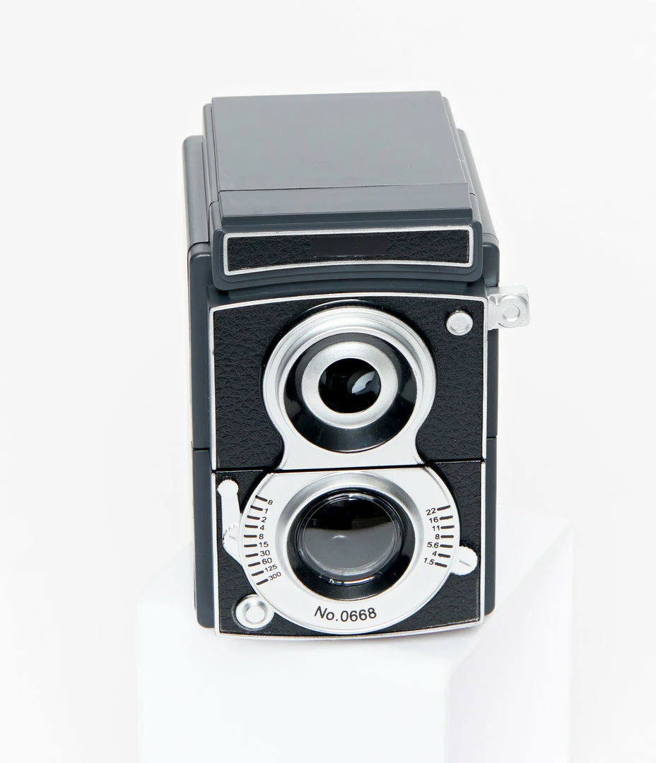 This handsome little vintage twin-lens reflex camera is actually a pencil sharpener in disguise. Instead of loading it with film, simply stick a pencil into the top “lens” and turn the crank handle on the back to sharpen it.