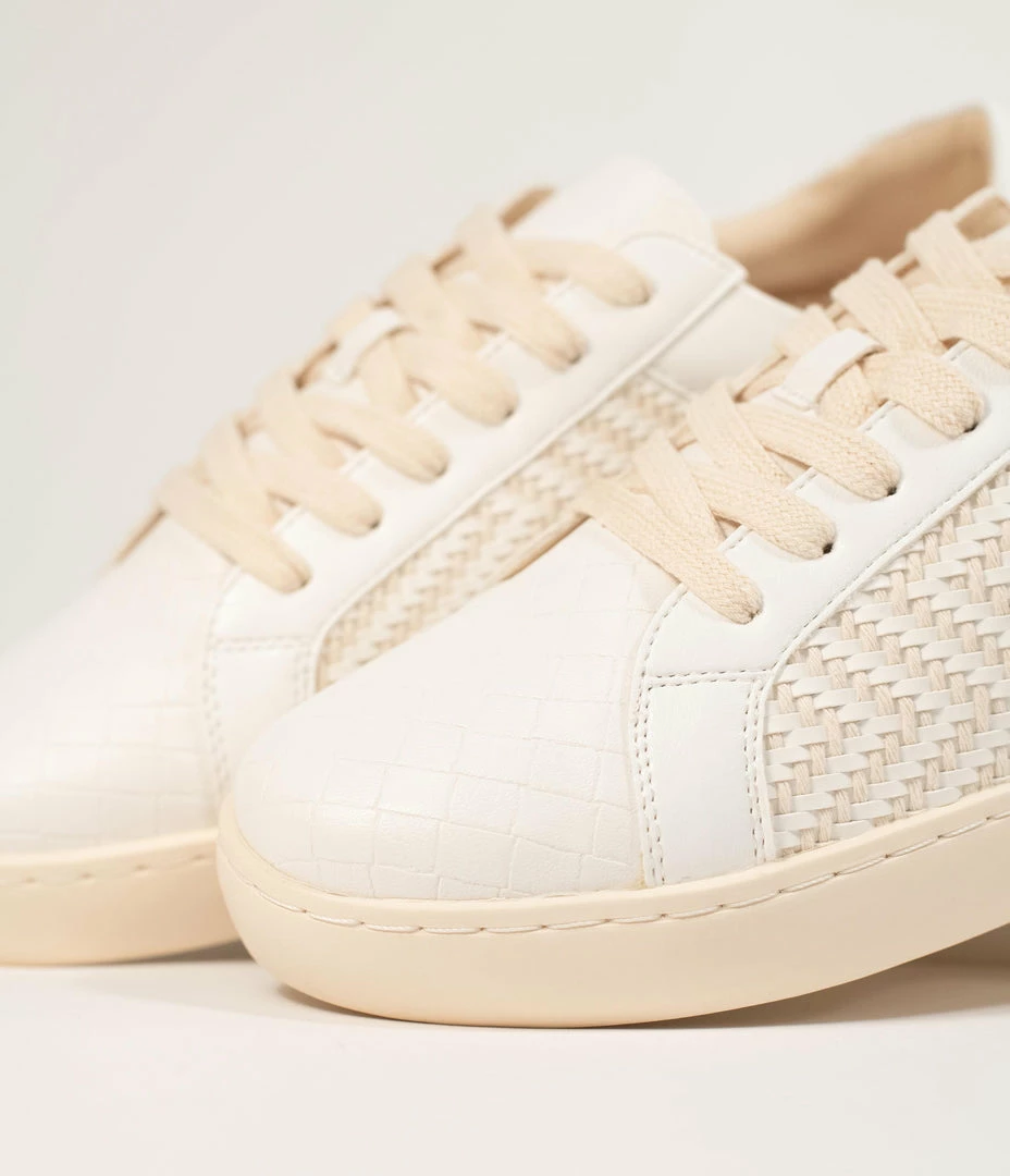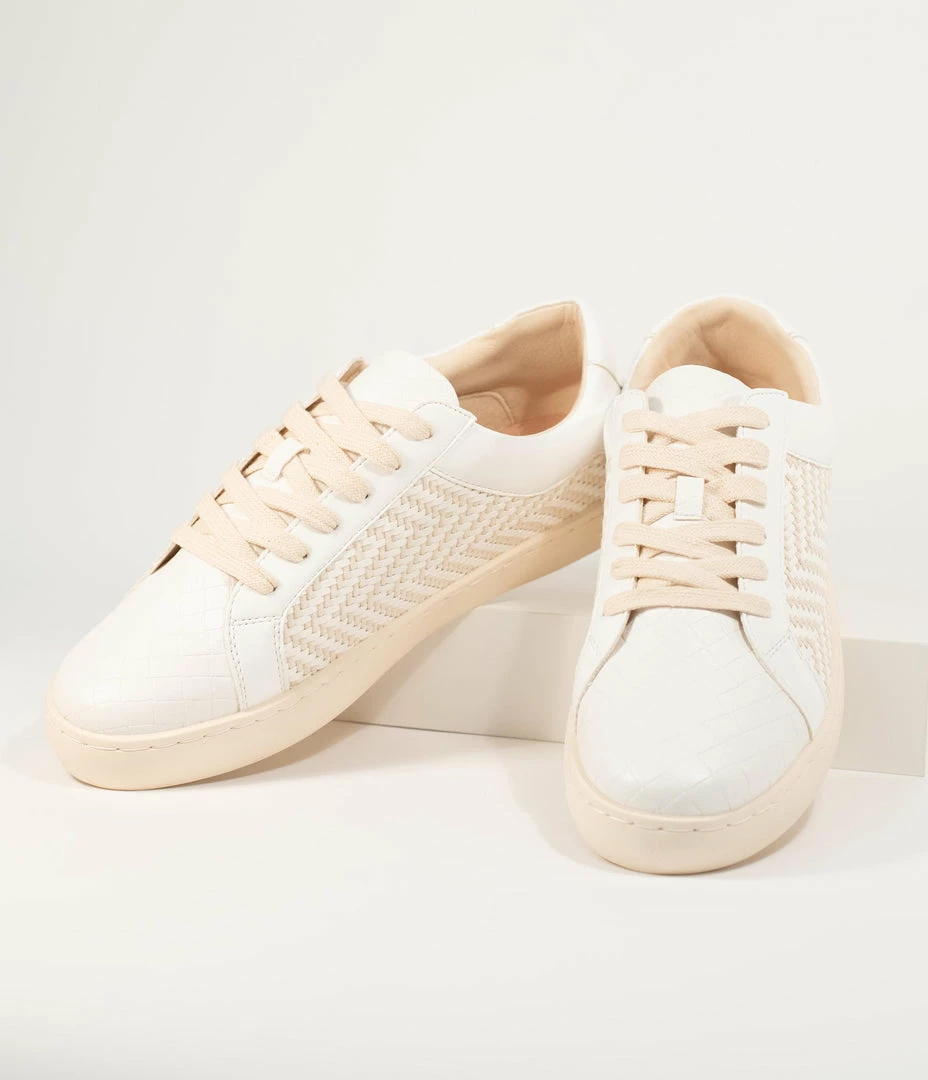 Sneakers forever! These fabulous cream kicks are crafted in a gorgeous leatherette and features an eye-catching woven chevron pattern in leatherette and woven cord. The lace up front and 1 inch sole keep you comfortable!