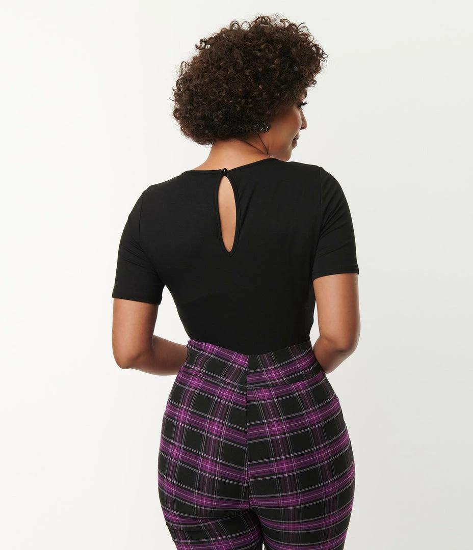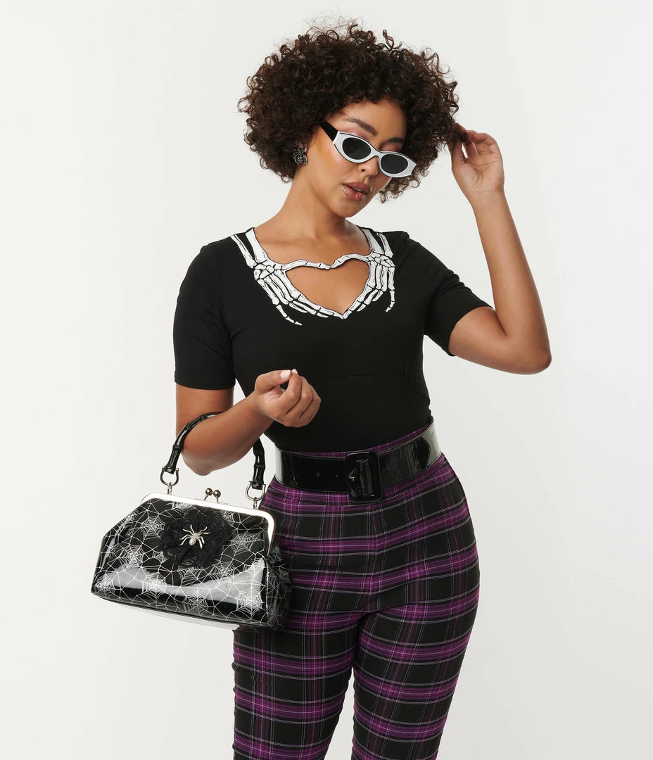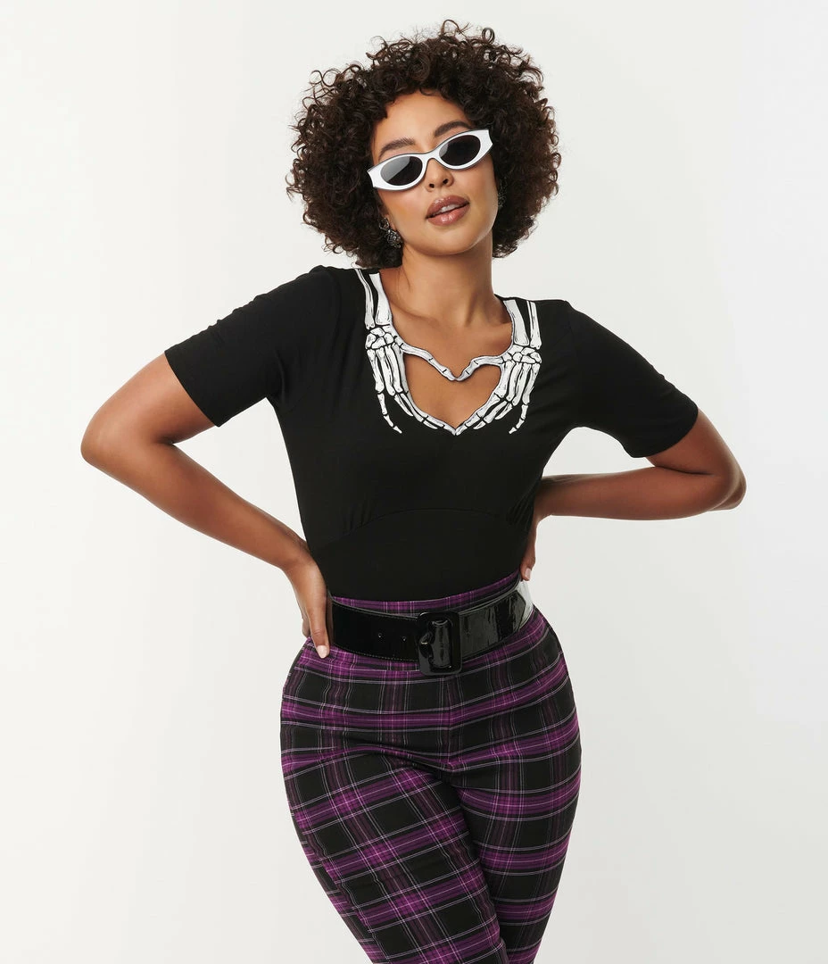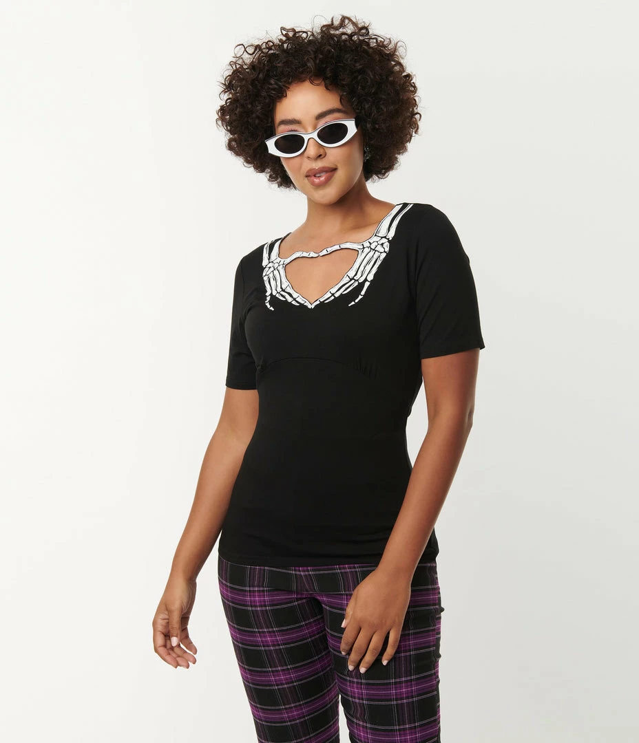 Scary spooky skeletons need love too! This gorgeous separate is crafted in a marvelous stretch knit to hug your curves for a drop dead silhouette. Set in a black , the stunning heart shaped keyhole design is framed by a graphic of white skeleton hands to create a sweetheart neckline that flatters your visage, and secured in the back with a button. Complete with short sleeves for a spooky classic silhouette!