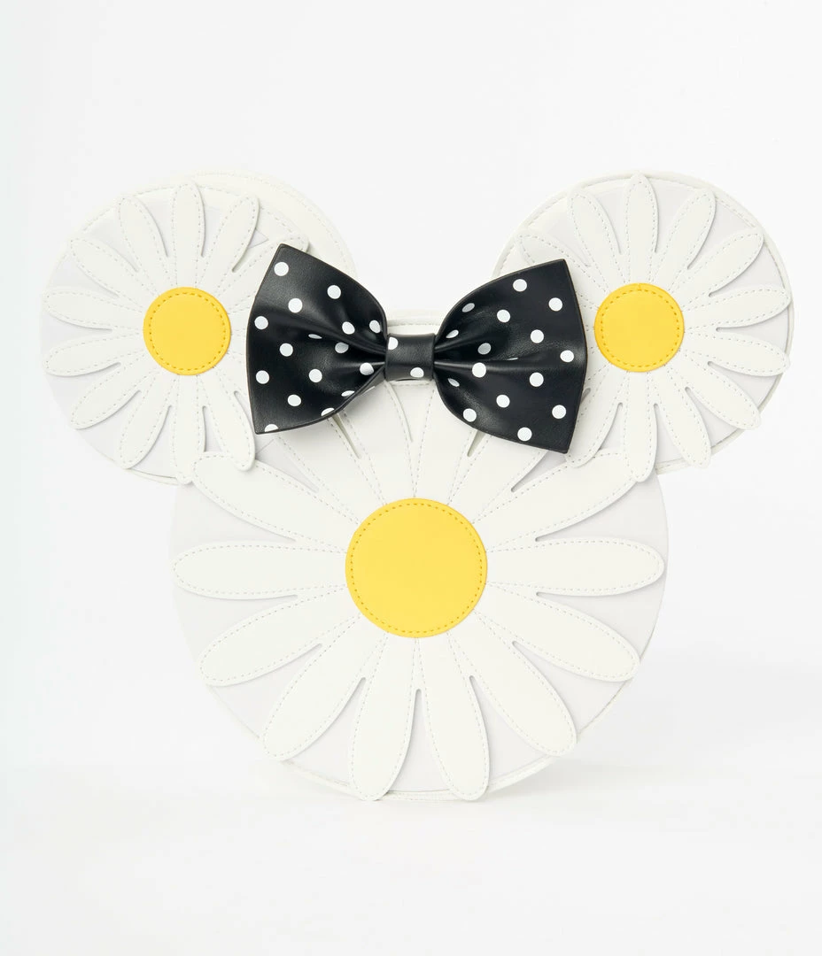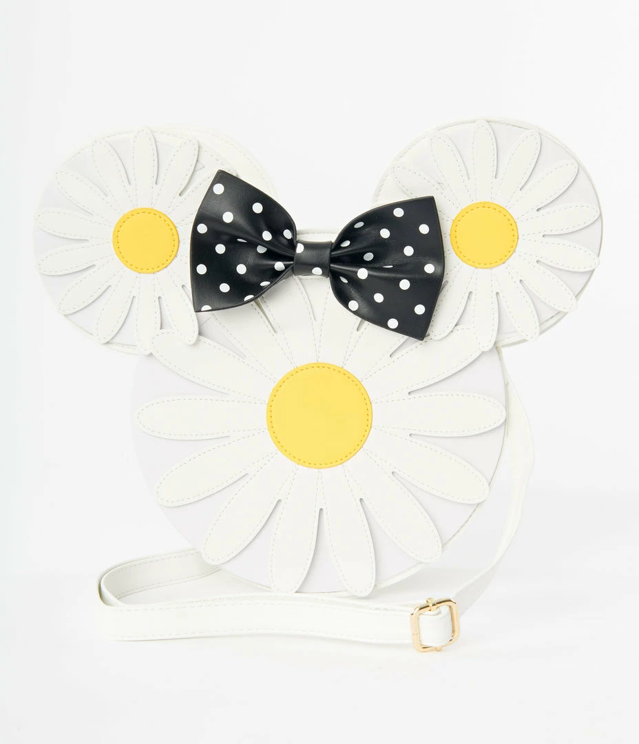 This sweet crossbody bag from Loungefly is crafted in white leatherette and boasts three daisies to create a fabulous Minnie Mouse head, complete with black and white polka dot bow. Complete with inner zip pocket, and adjustable crossbody strap.