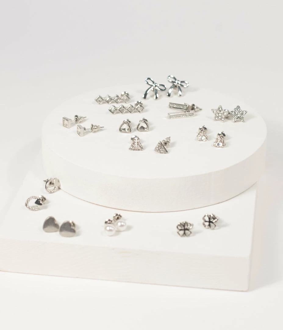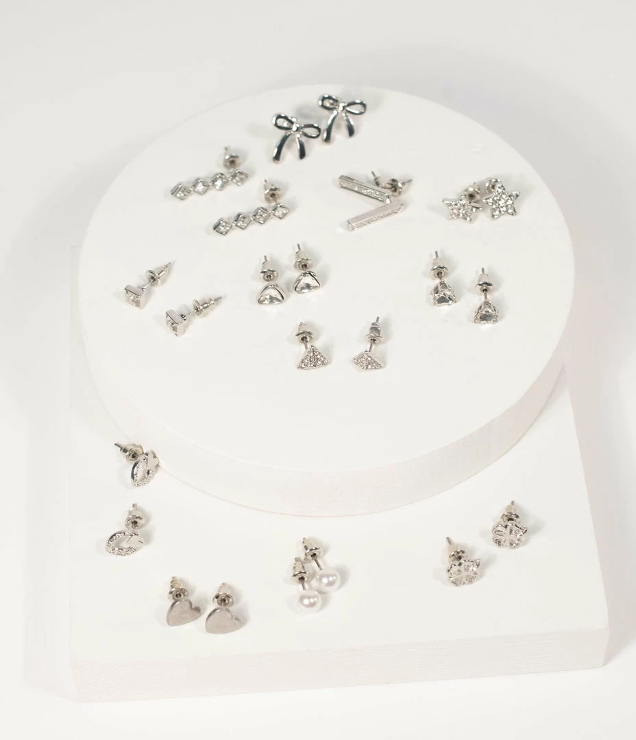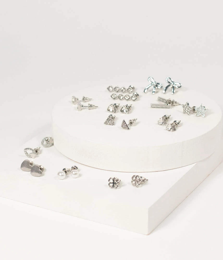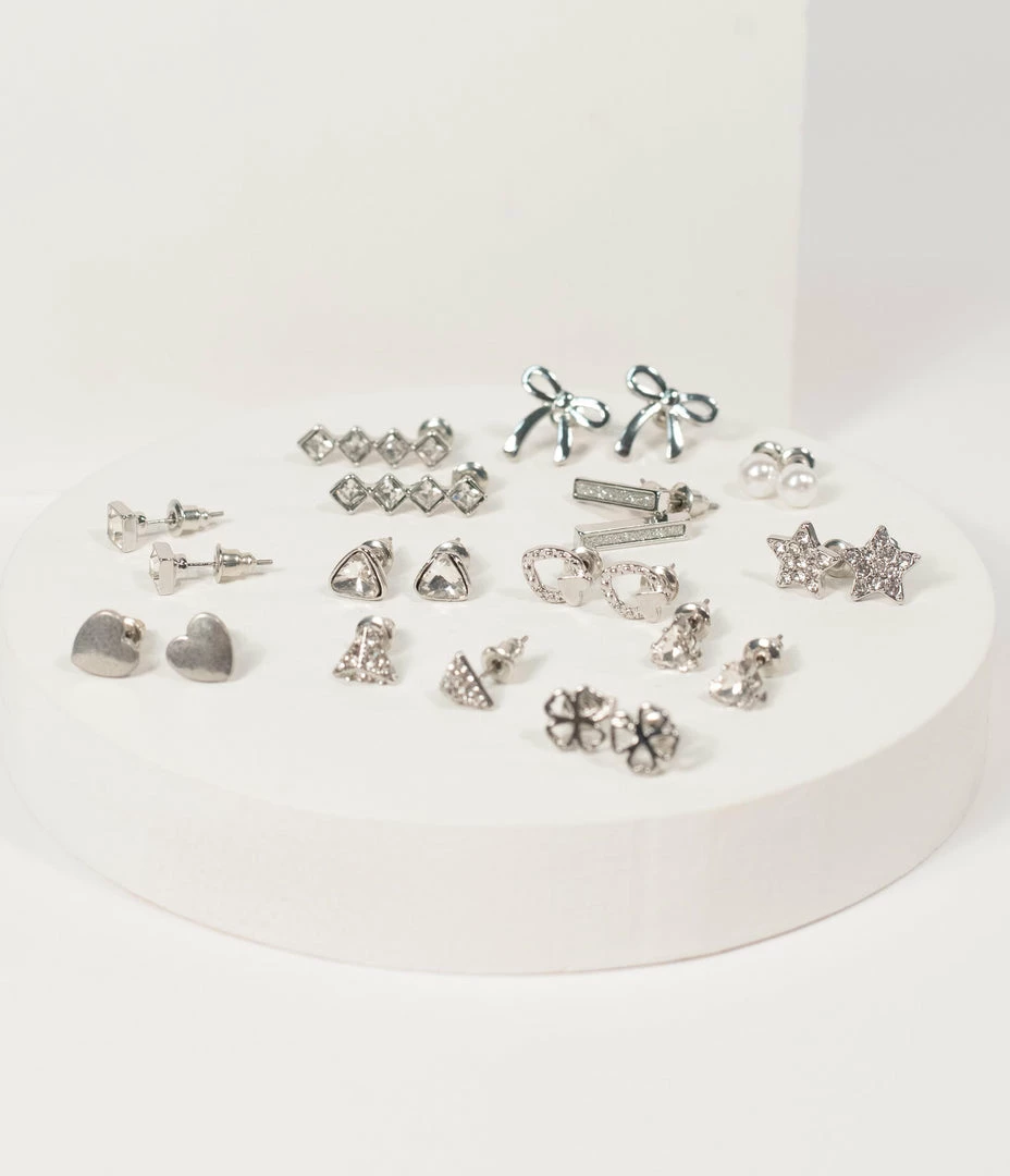Add a dash of sparkle to your wardrobe! This set of twelve silver hardware earrings features assorted shapes including hearts, clovers, bows, stars, and faux pearls accented with rhinestones. Secured with post backs and dainty enough to wear any day.