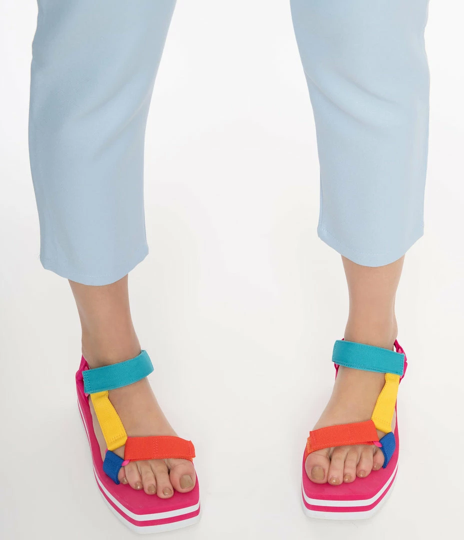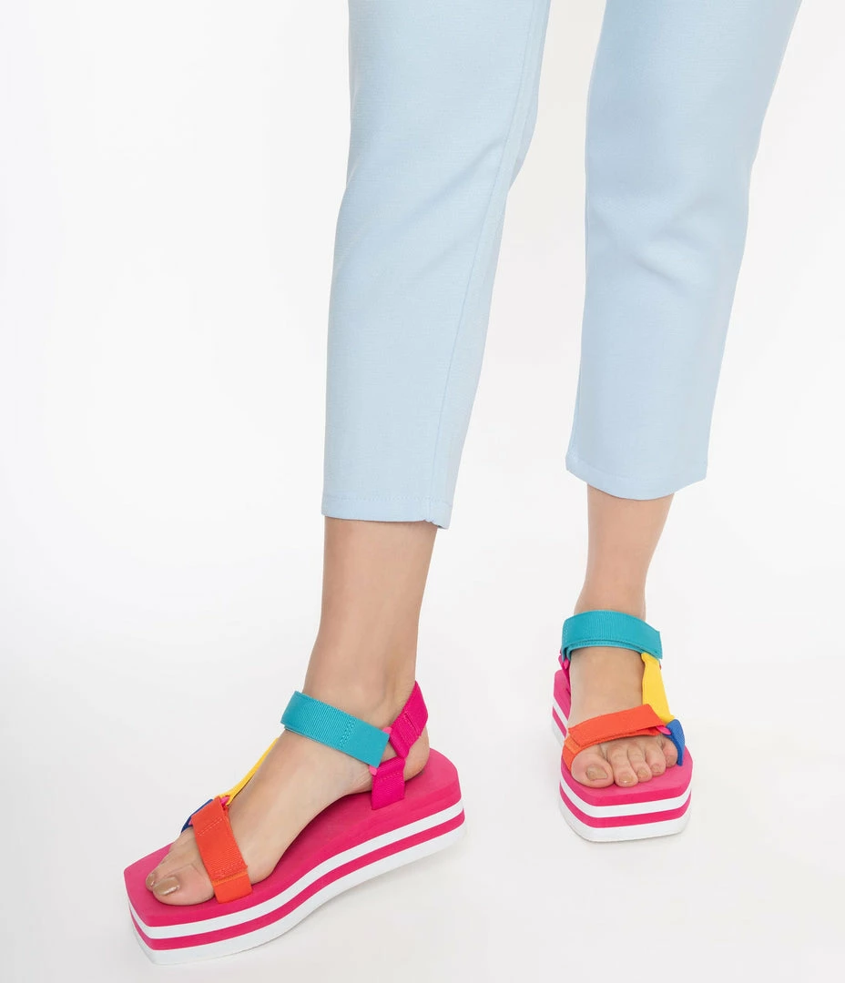 Kick up the flirtation with these radical platform sandals, boasting a pink and white stripe 2 inch wedge and 1.5 inch platform. A rainbow variety of grosgrain flat cords keep you bodacious while the vamp and ankle strap are secured with velcro!