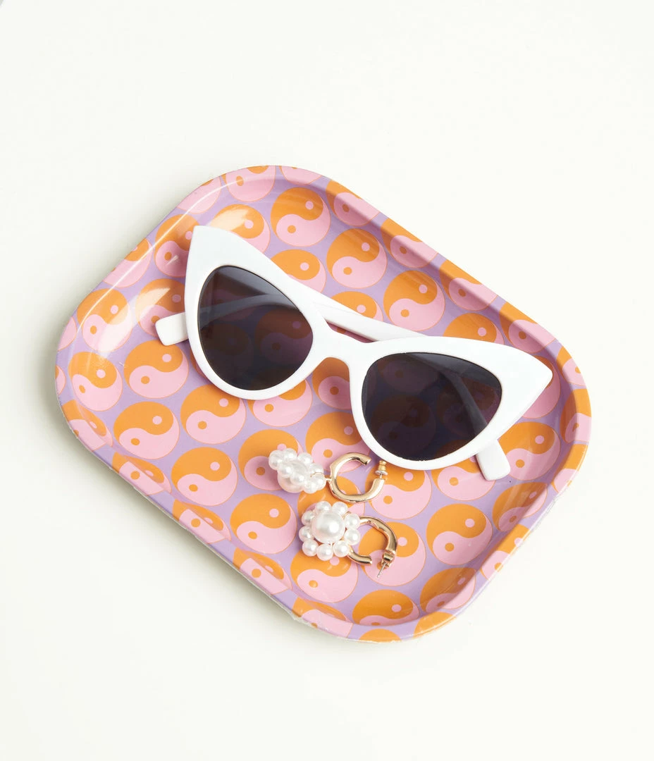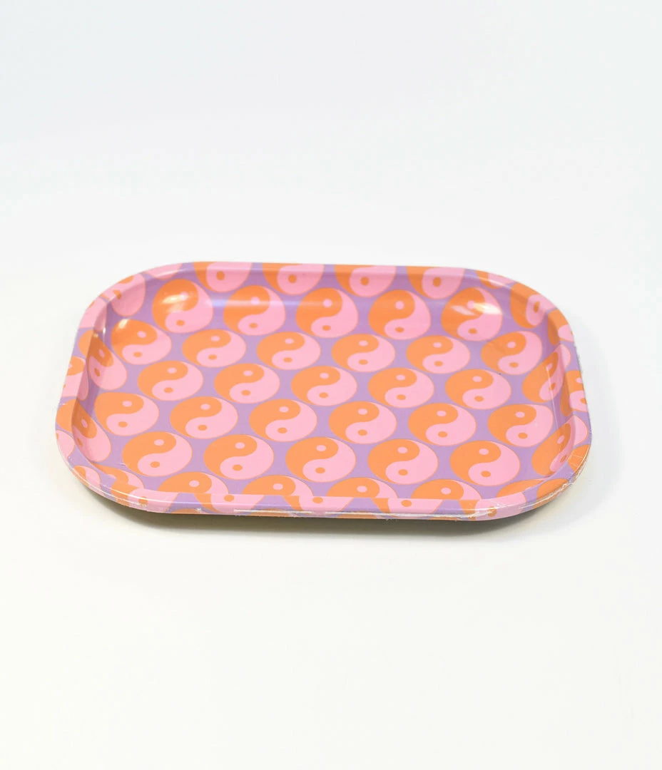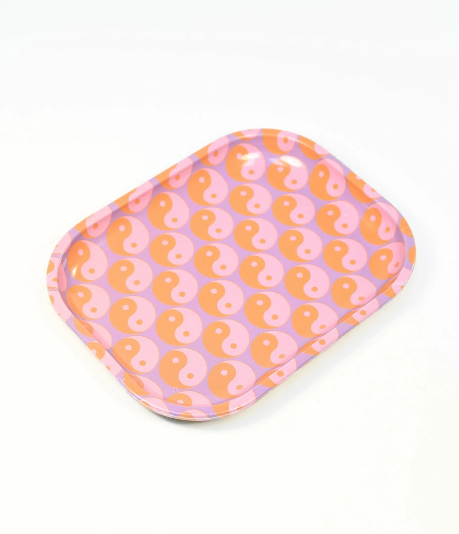 A balanced catch all tray for your home needs! Crafted in tin with a 1 inch lip, this accessory features pink and orange yin and yang repeated throughout.