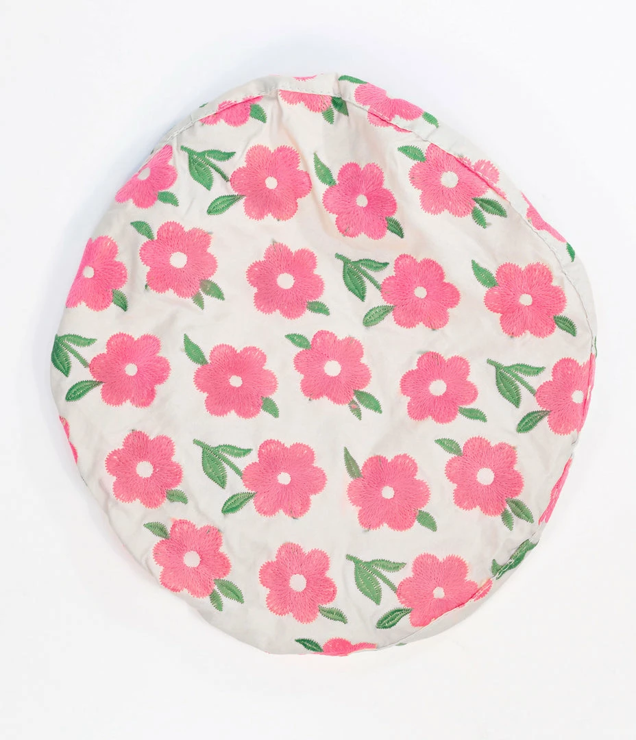Quintessentially romantic! This sweet beret is crafted in a cream colored woven fabric and boasts bright neon pink daisies embroidered throughout. Complete with inner grosgrain ribbon and adjustable ties!