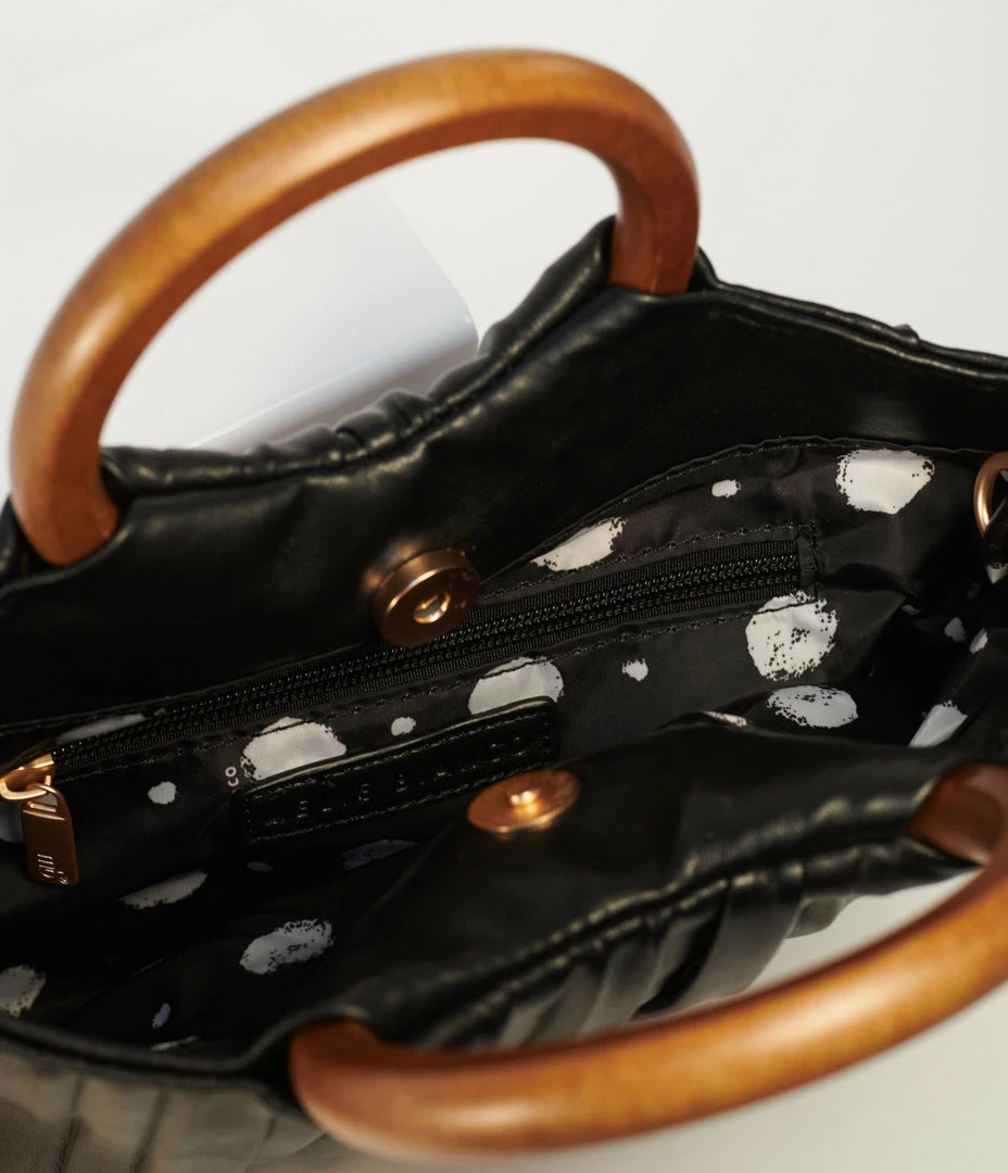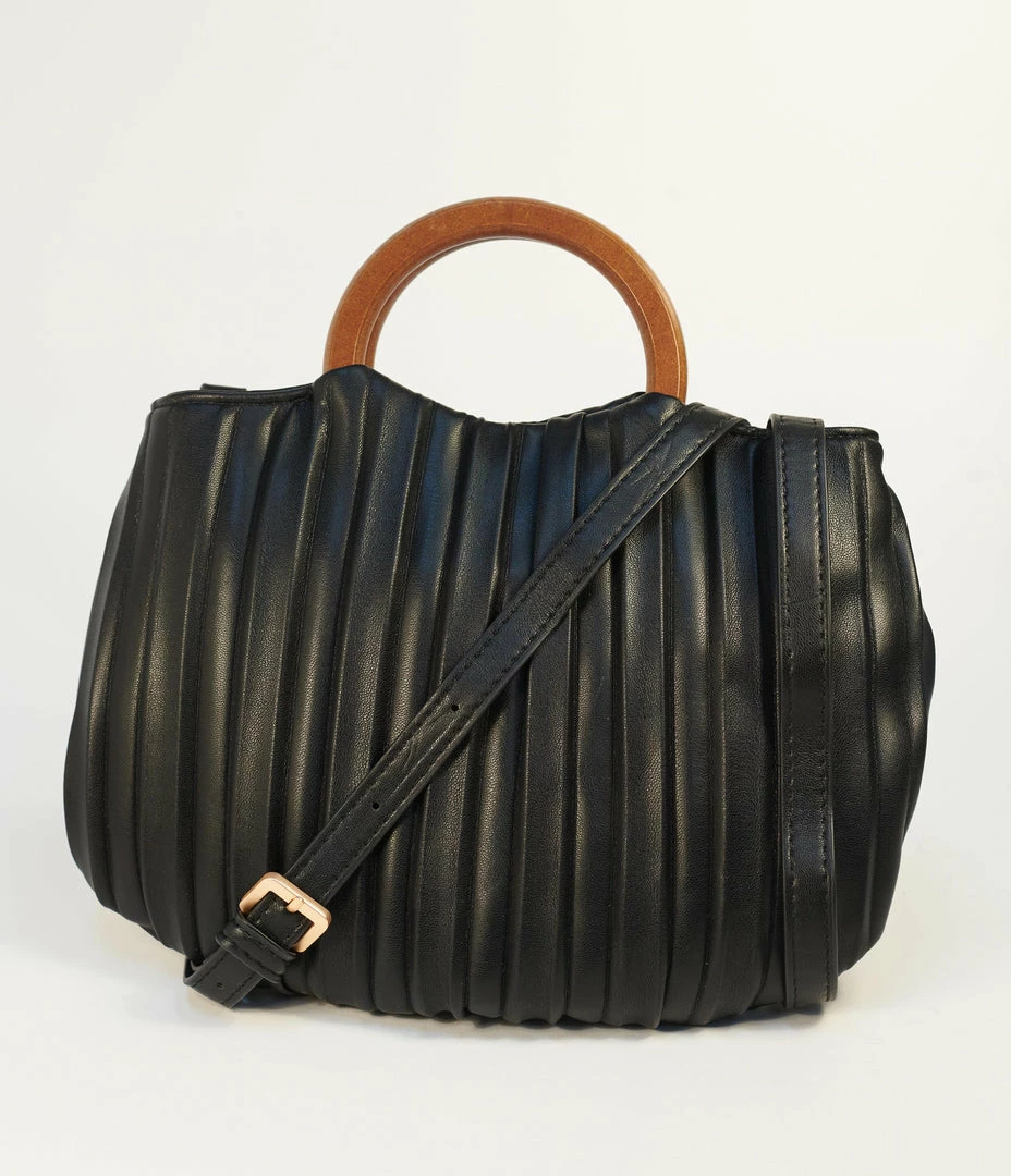 A chic addition for a soiree silhouette, this darling handbag is crafted in a smooth black leatherette, embellished with pleating detail. The dual top handles are set in a wooden style while the removable and adjustable shoulder strap provides versatile wear. A magnetic snap button secures the polka do fabric interior while an inner zipper pocket lends easy organization!