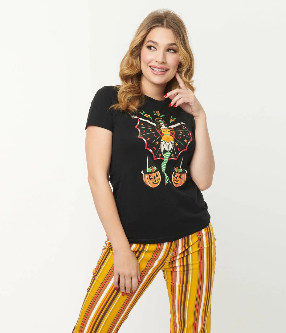 This mysterious fitted tee from Mischief Made is crafted in black cotton and boasts a graphic print of a masked pin-up vixen in a cape and two jack-o-lanterns. Complete with short sleeves and crew neckline.
