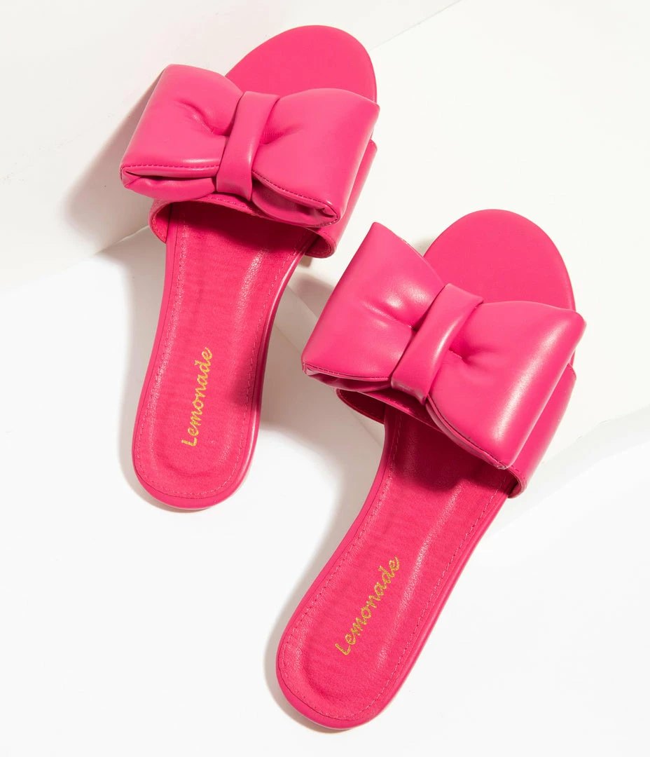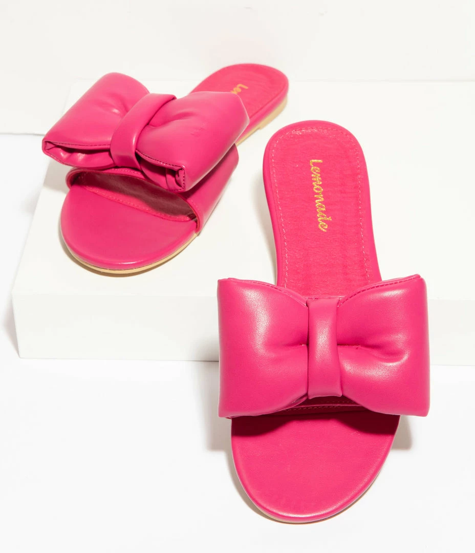 Watch them bow down, dears! These outrageous sandals are crafted in a marvelous hot pink leatherette and boast an oversized bow on the vamp. Complete with a cushion insole and minimal tread!