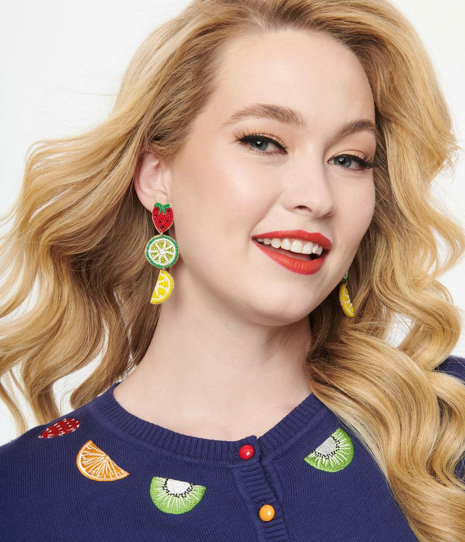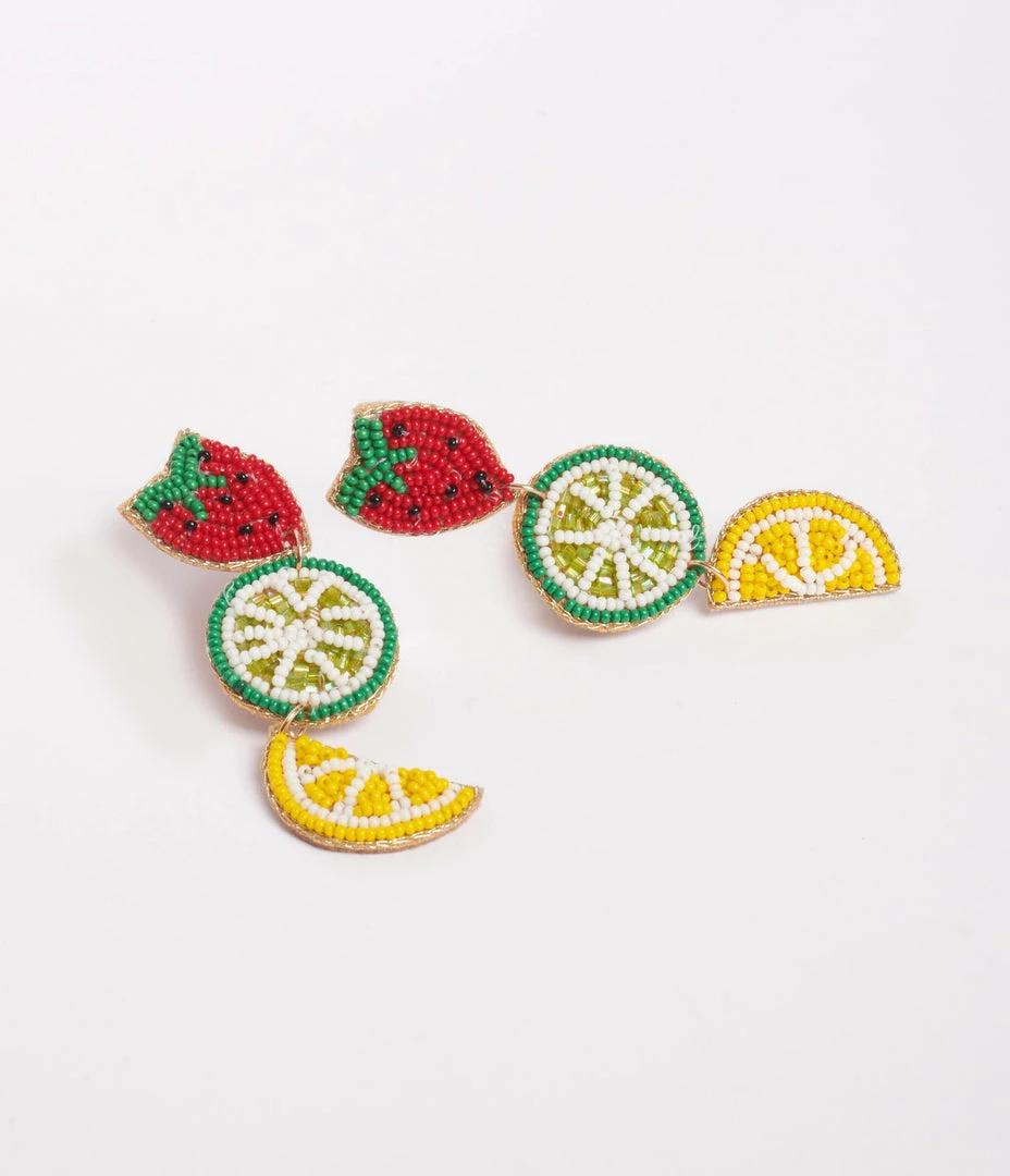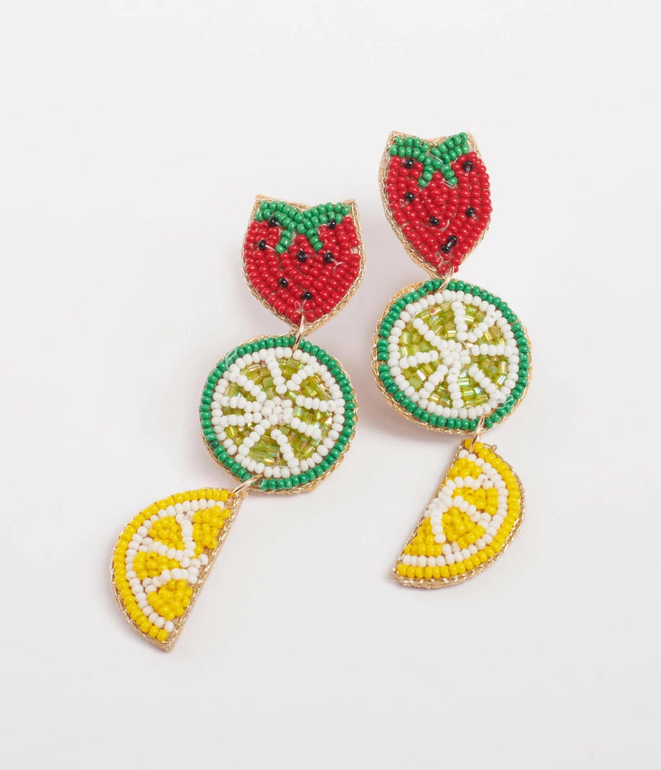 Keep the summer vibes going with these drop earrings, featuring beaded strawberries, limes and lemons on felt backing. Secured with post backs!