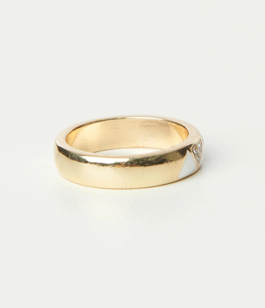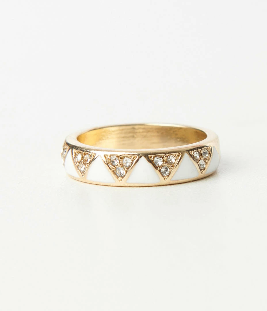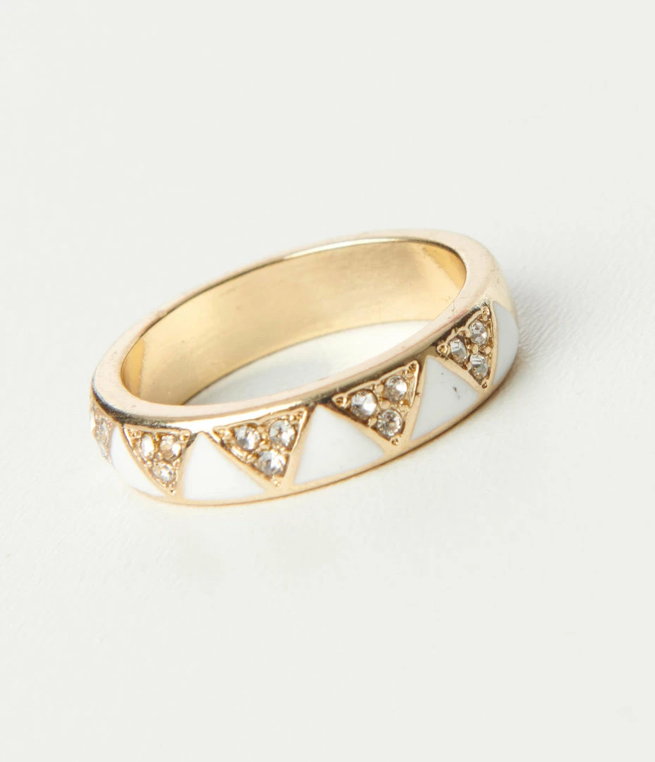 This dazzling ring boasts a sweet design of white enamel and rhinestone triangles set in golden hardware.