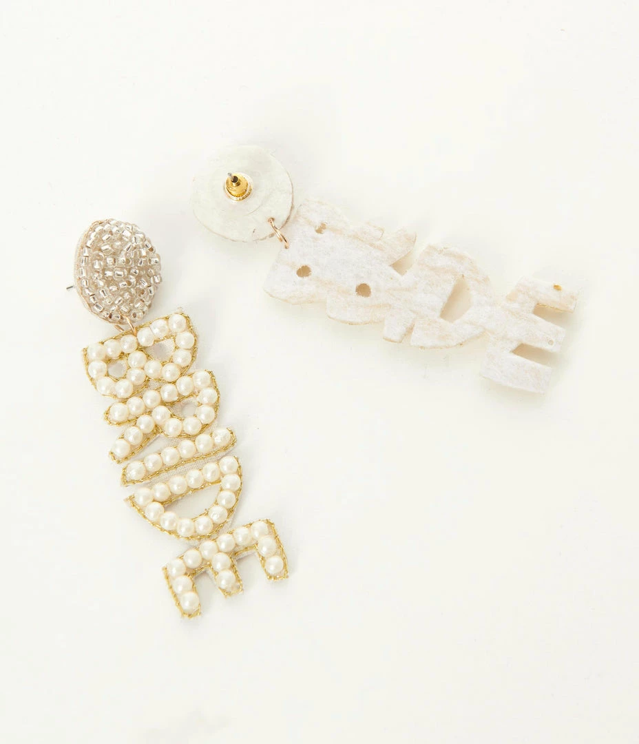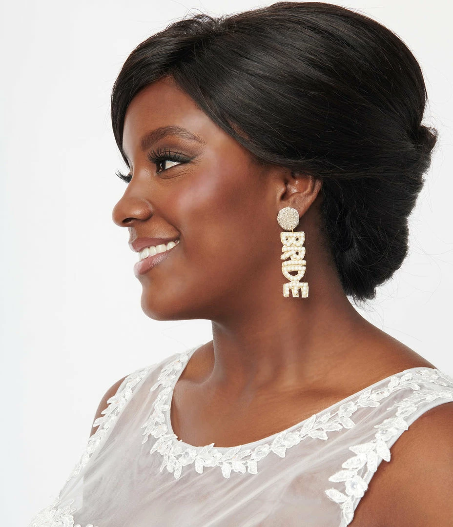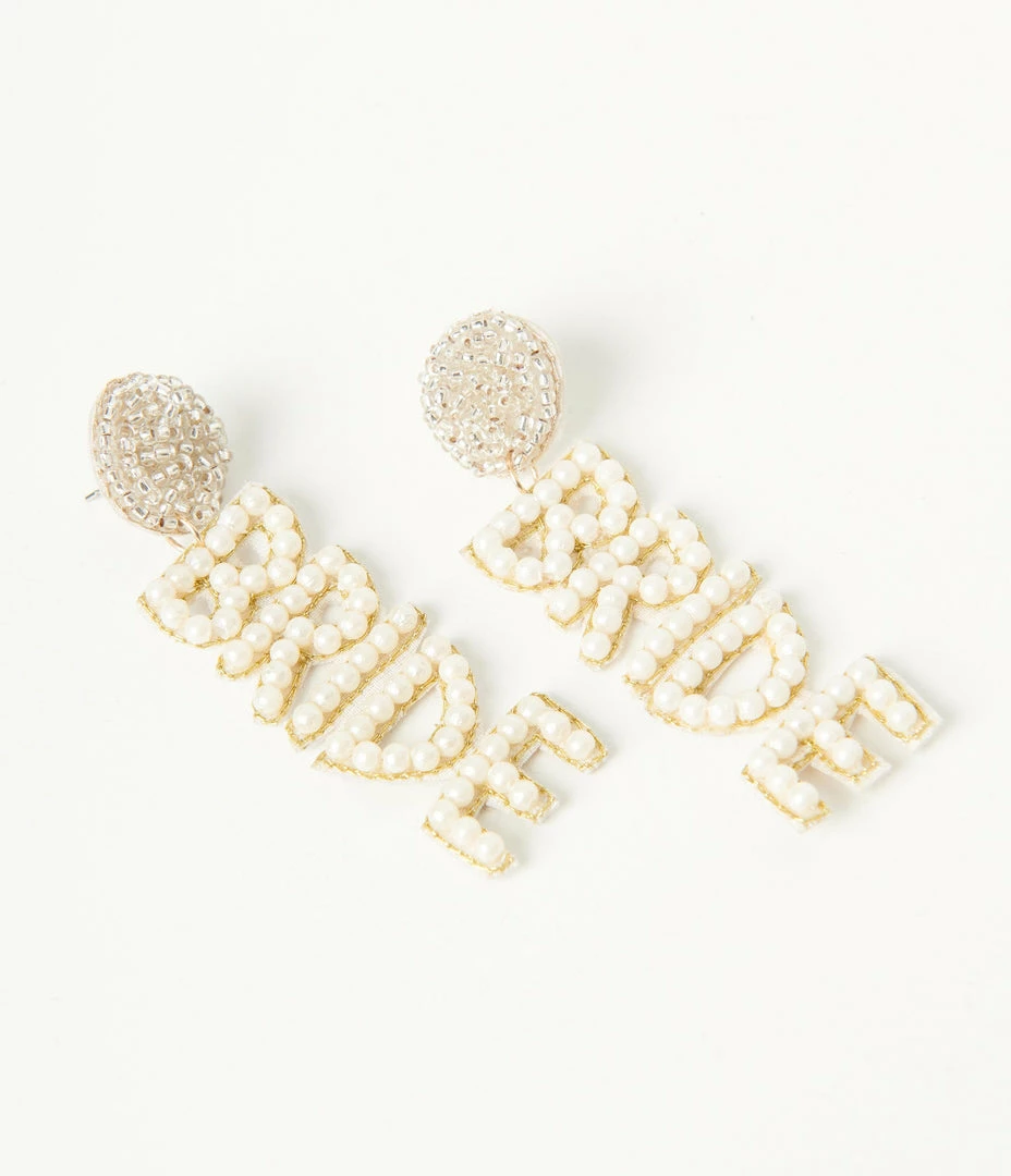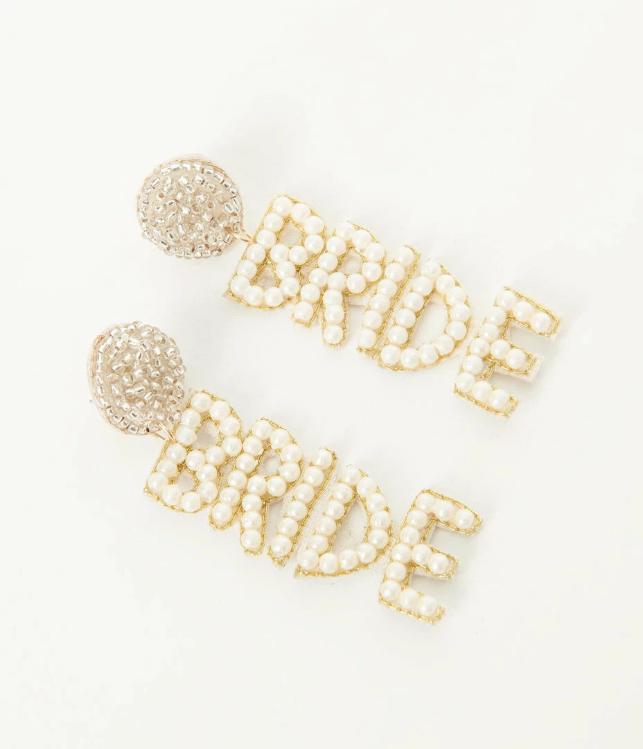 These sweet drop earrings boast the font ‘Bride’ in faux pearls. Complete with post backs.
