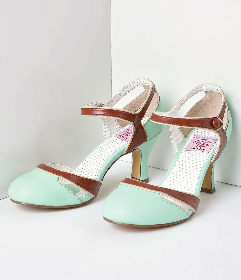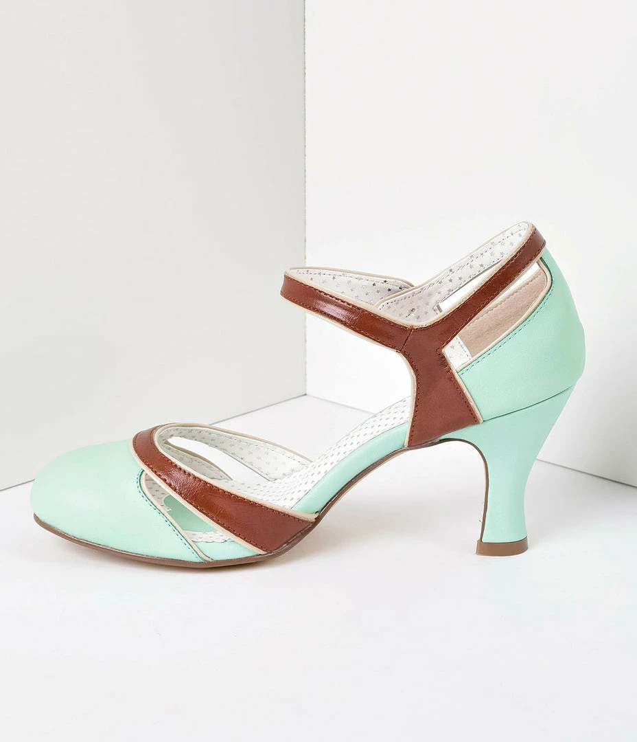 Assertively adorable! Crafted in a marvelous leatherette mint, the kitten heels lend a cute lift while a charming brown contrast leatherette highlights the sweet dĂƒÂ¢ aOrsay design with cutouts. This charming pair features a faux button and gored ankle strap, a classic round toe, and cushion insole. Balanced on a 3″ heel in an elegant silhouette and crafted in man-made materials.