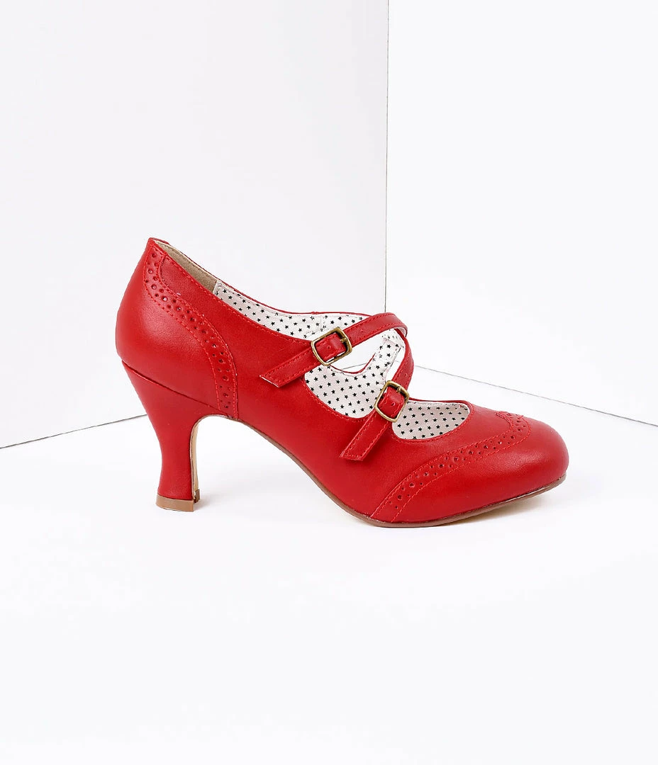 Create a spectacular look with those finished details, darlings! Your shoes will help you complete that fashionable look of your dreams just take a look at these red faux leather mary-jane style strap shoes that come in 3 inch heels! Hot, hot, hot! A unique double strap design creates a criss cross look that buckles on the outer side. The buckles also come with a stretchy gorde for more comfort! These shoes also come with cute detailing throughout the toe.