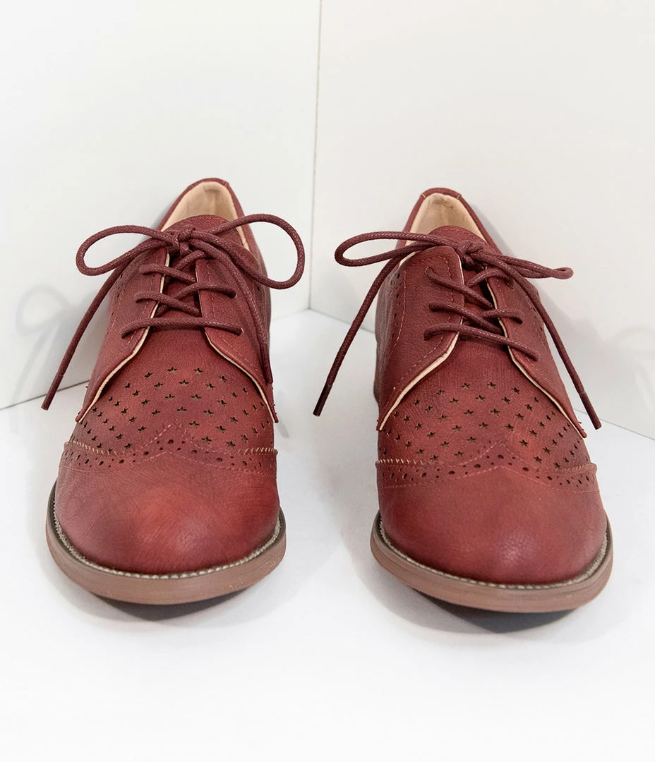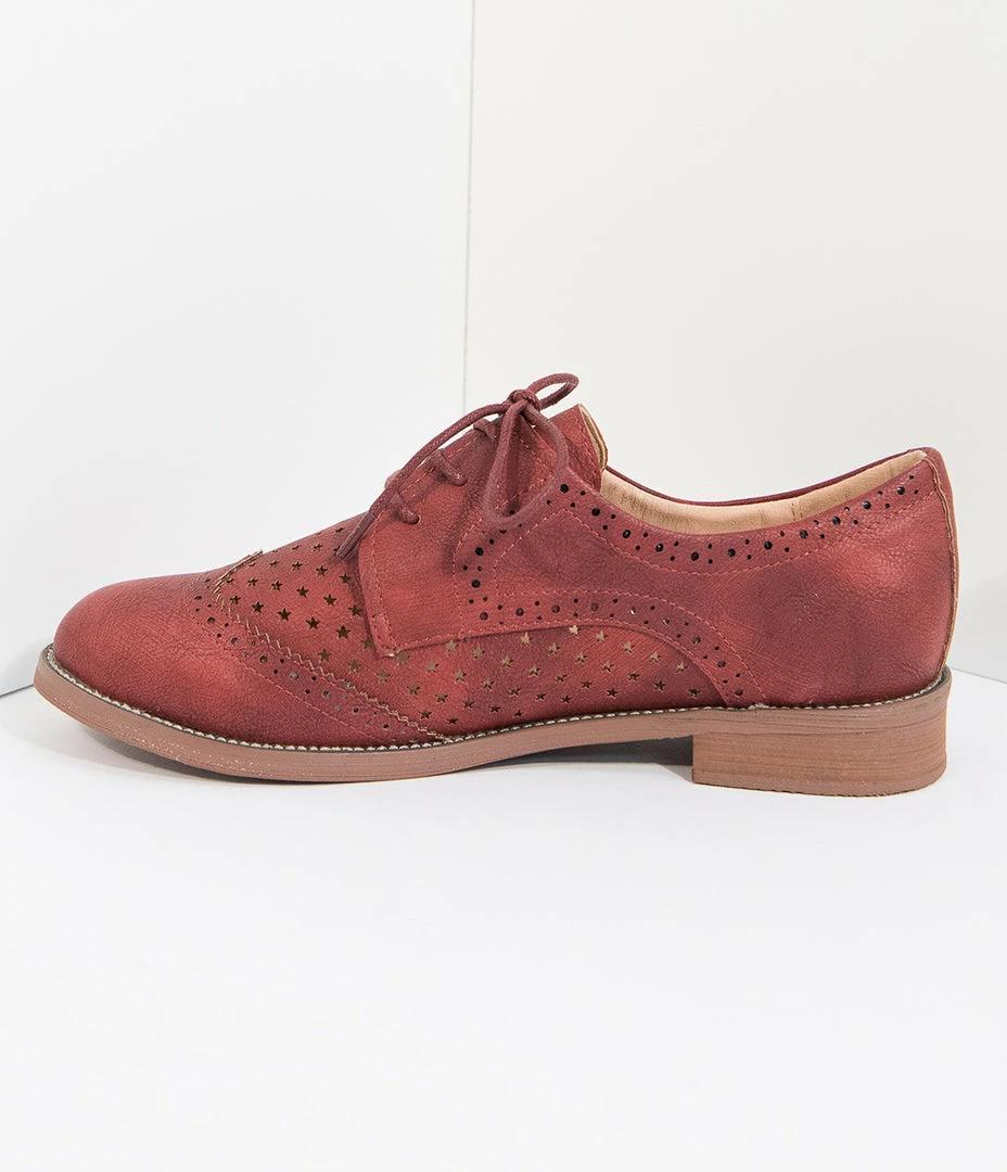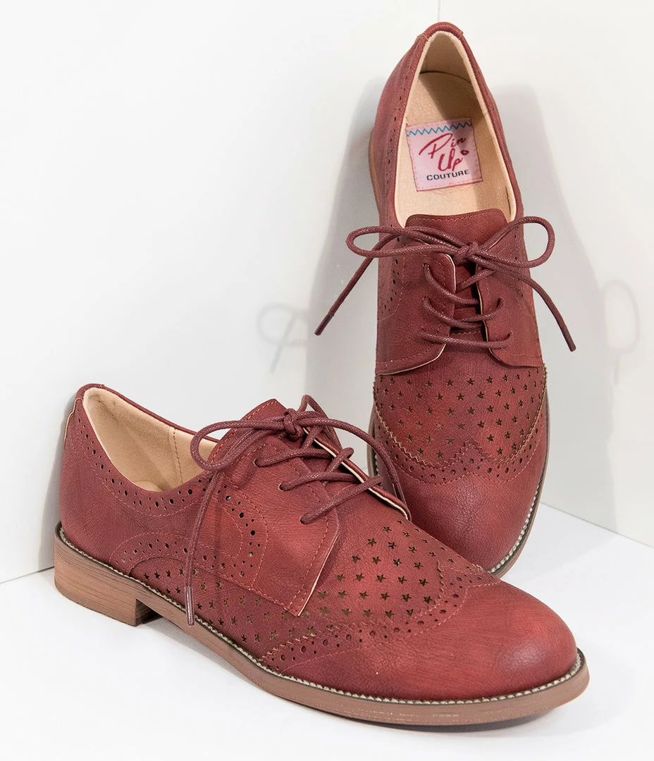 A sweet classic for a mid-century maven, dear! These cherry red leatherette oxfords are an essential piece to your retro wardrobe with a lace up vamp and wingtip embellishments. Complete with star cutouts and 1 inch. heel, you are ready for some old school flaunting!