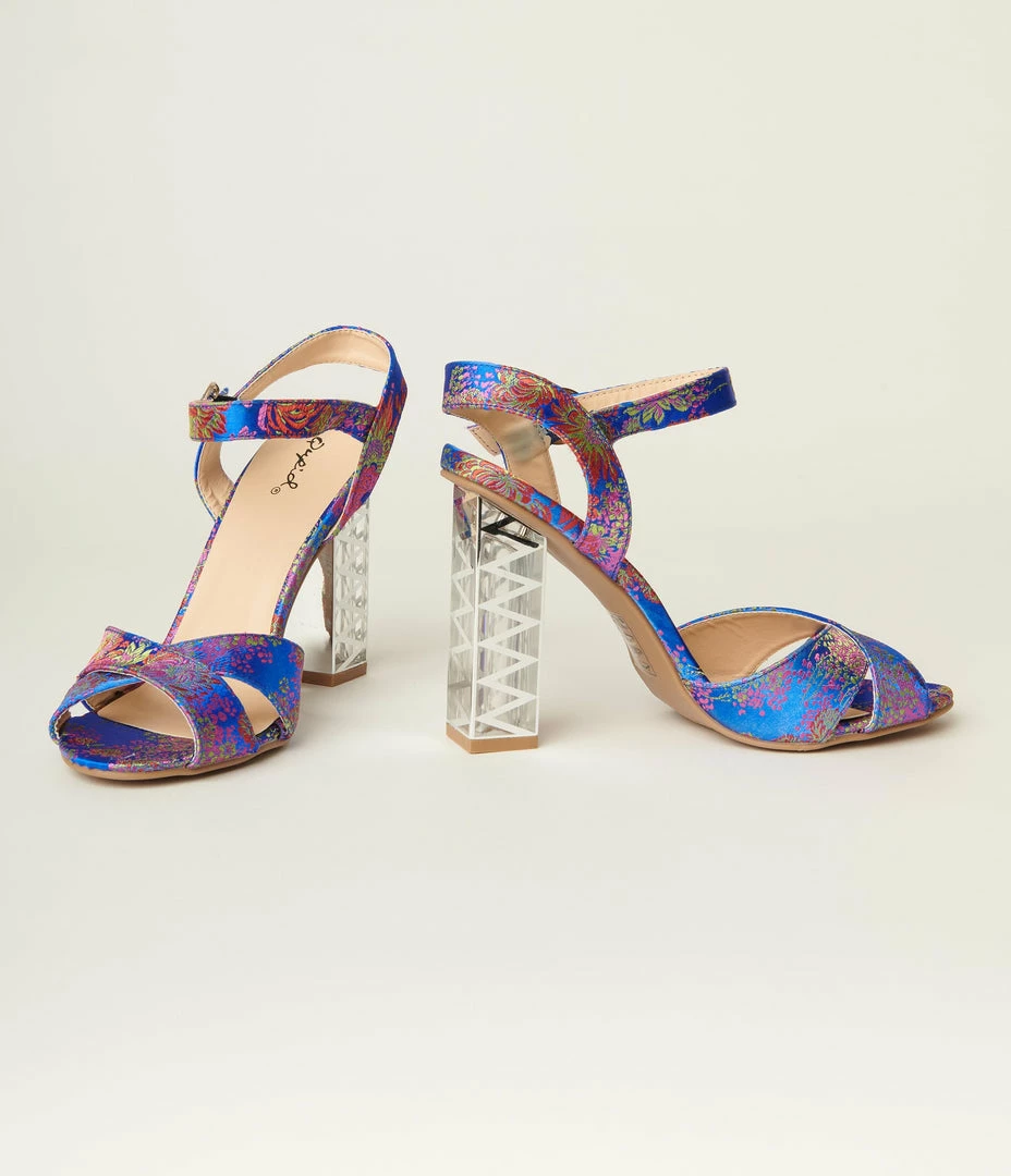 These dazzling heels feature a gorgeous blue and multicolored floral woven fabric. The 4.5 inch square acrylic heel boasts a metallic silver chevron accent and is secured by the gored buckle ankle strap.