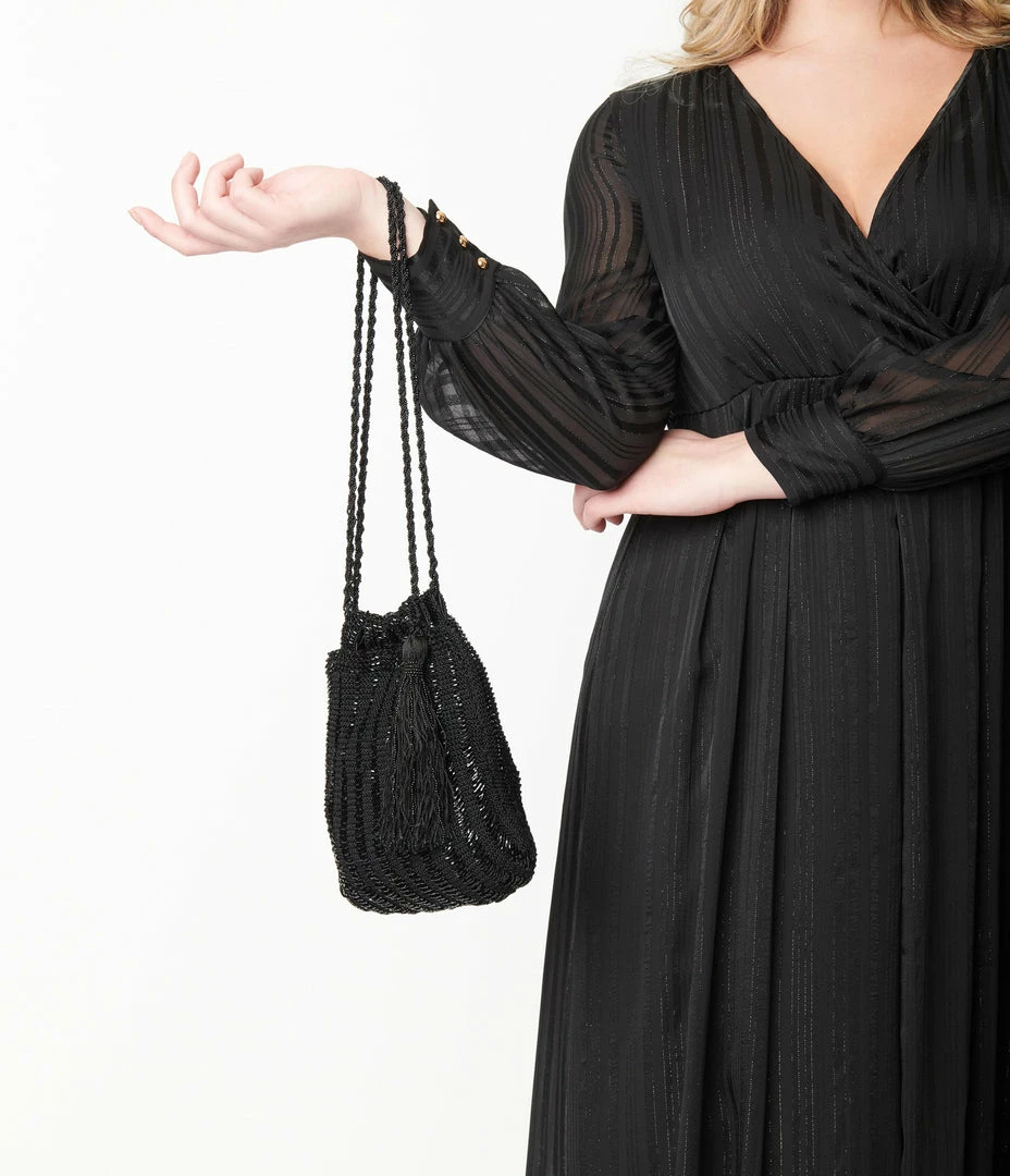 Ricki Designs Flapper Accessories Vintage Style Black Beaded & Crochet Tassel Purse