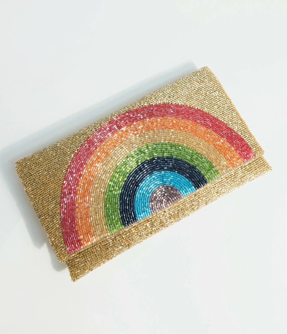 Here’s the gold at the end of the rainbow, dolls! This glittering clutch features a beautiful array of golden beading throughout while a stunning multicolor rainbow sits on front. The dual magnetic fold over opens to a gleaming golden fabric interior, complete with an inner slip pocket. A removable golden chain allows for versatile wear.