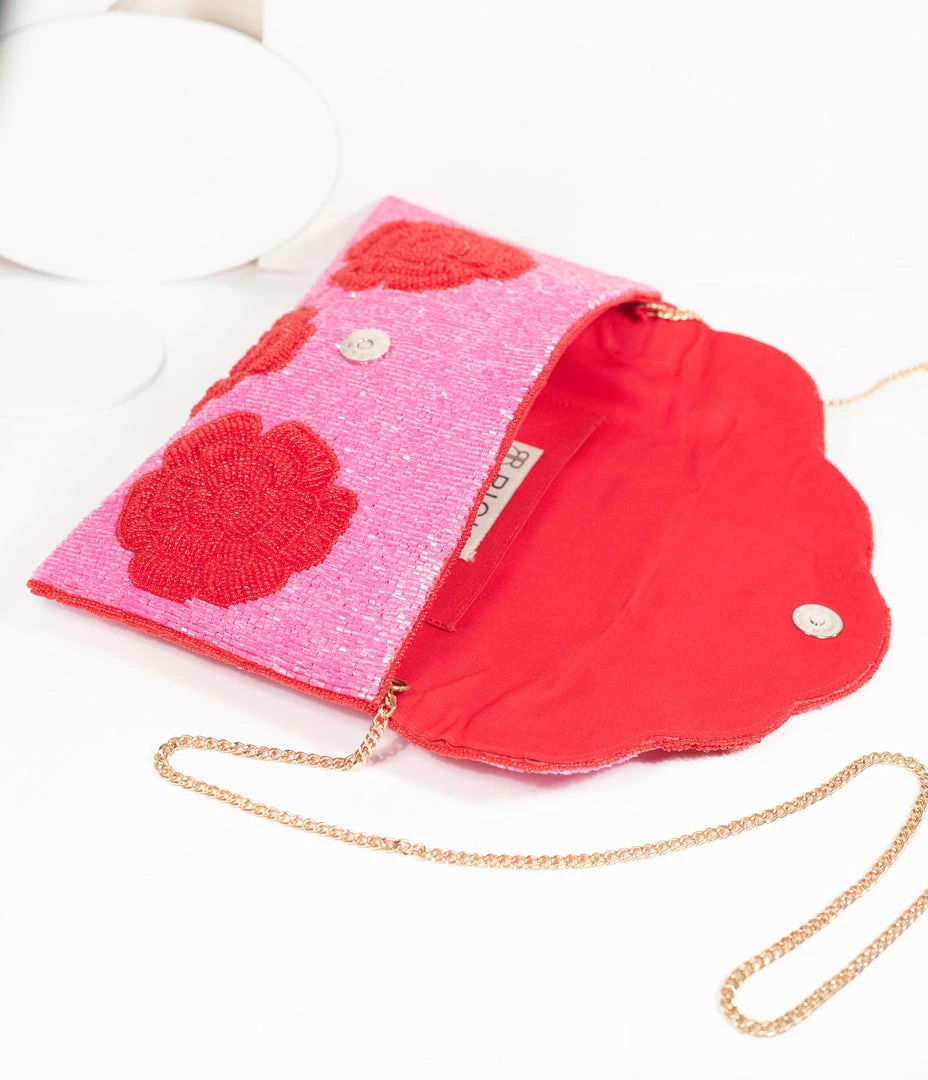 A dash of romance, darling! This beautiful envelope clutch is covered in a stunning beaded scene of red roses blooming through a pink beaded backdrop. This gorgeous accessory opens by a magnetic closure into a soft red interior with an inner slip pocket. Complete with a chain link shoulder strap for versatile carry of this garden staple!