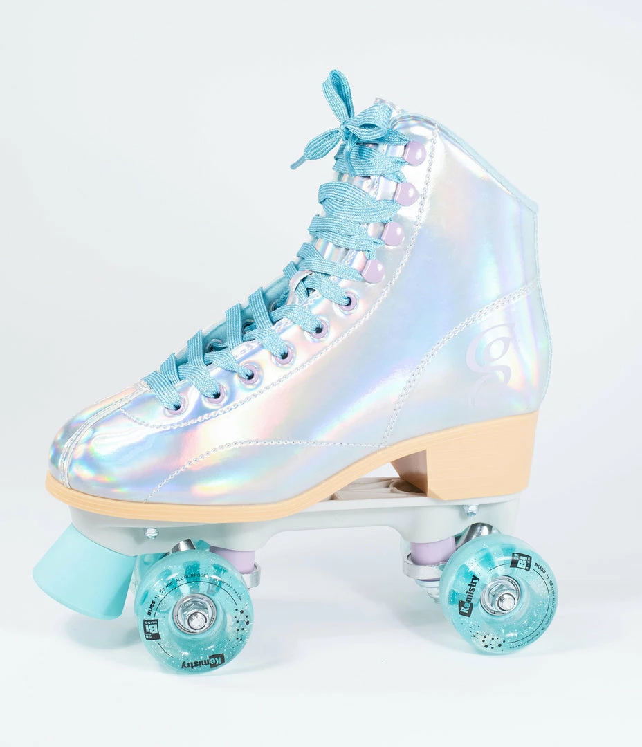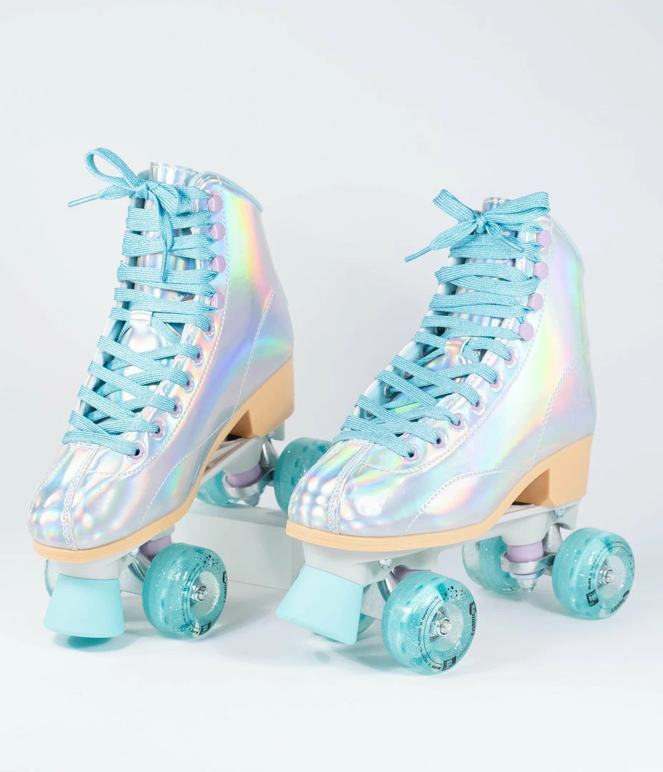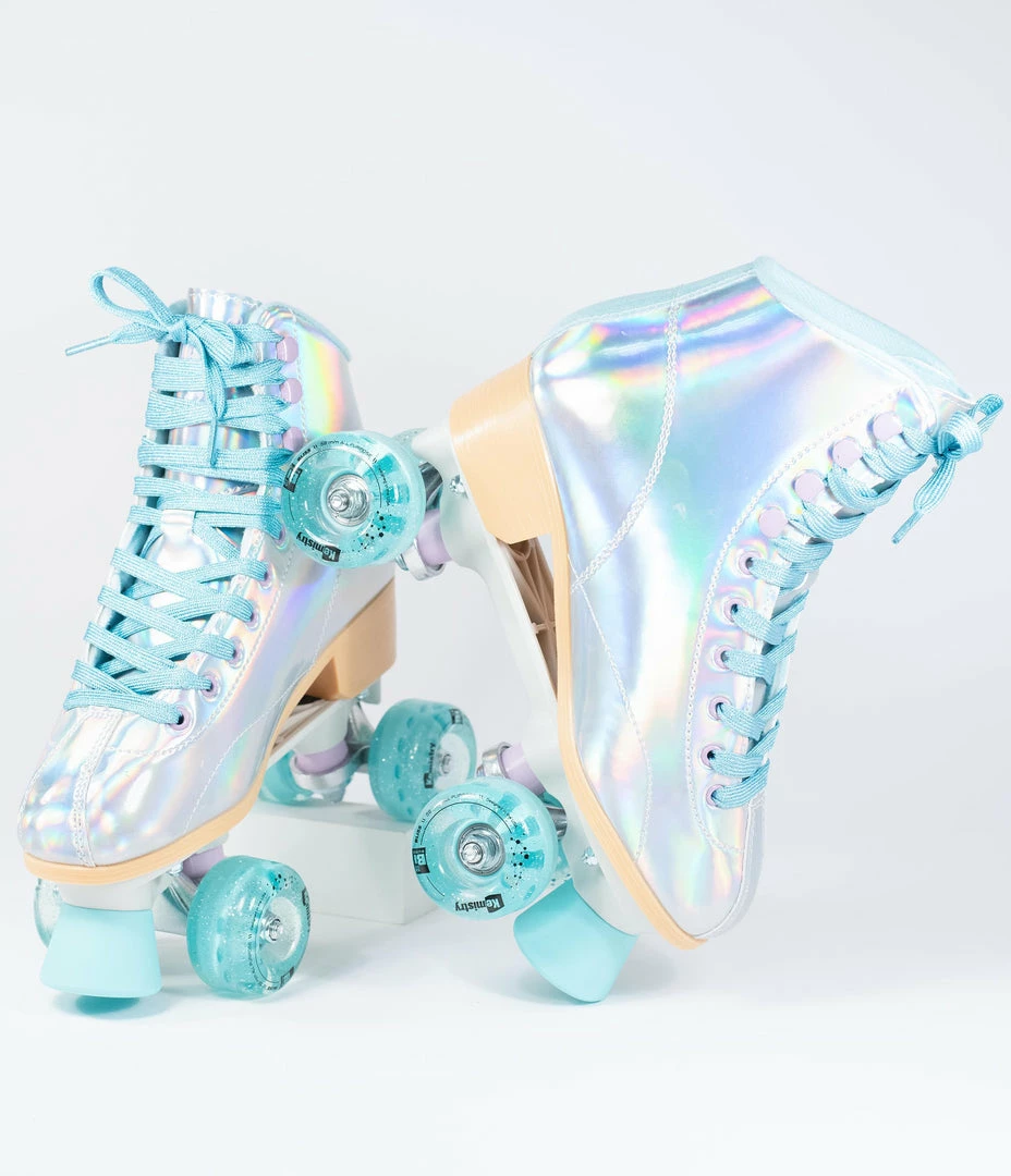 Dance, glide, and spin to your heart’s content, darling! Lace these roller skates up and hit the park in style, featuring a gorgeous holographic upper and cinched with sparkling blue laces. Trucks and cushions help you glide on your turns while the polyurethane wheels and carbon bearings provide fabulous control. Complete with a front brake, mix your fun and fashion for a whole new decade!