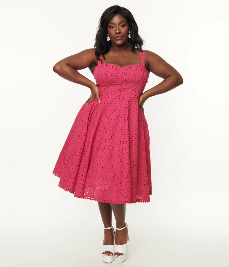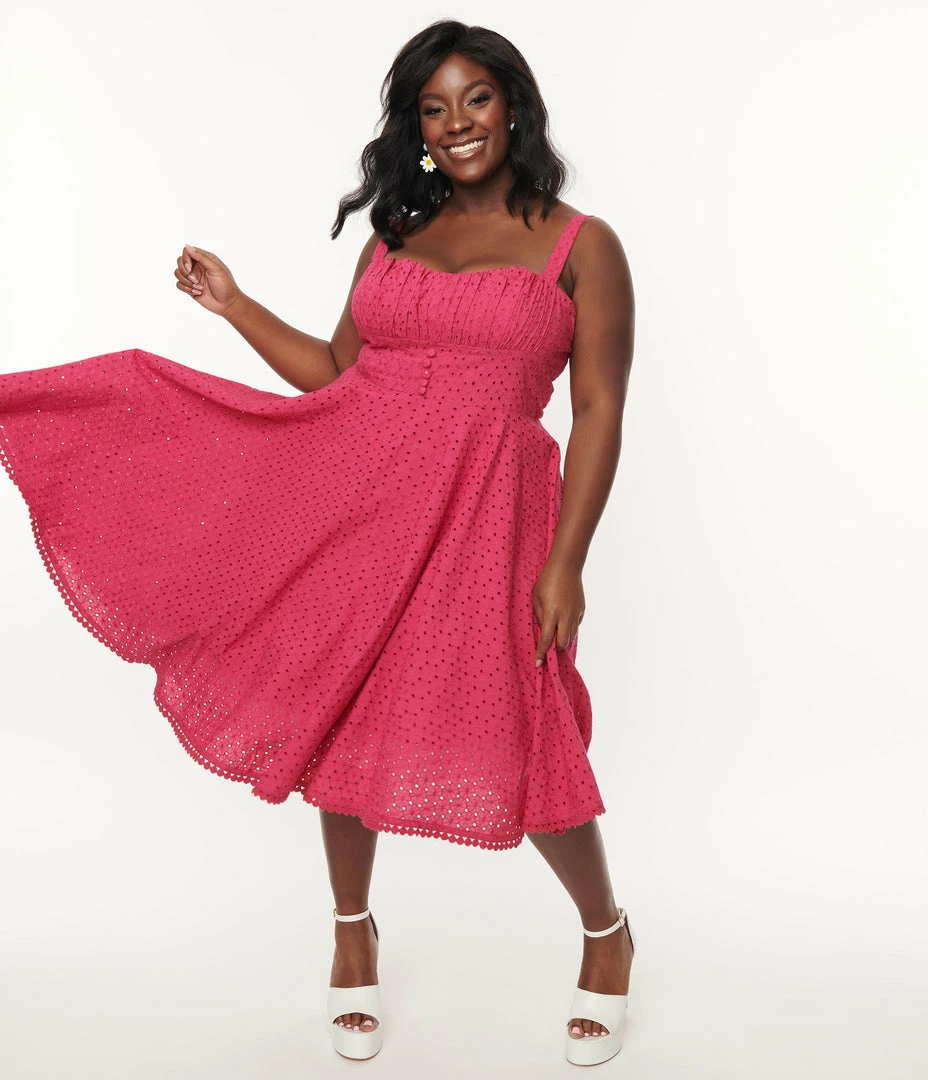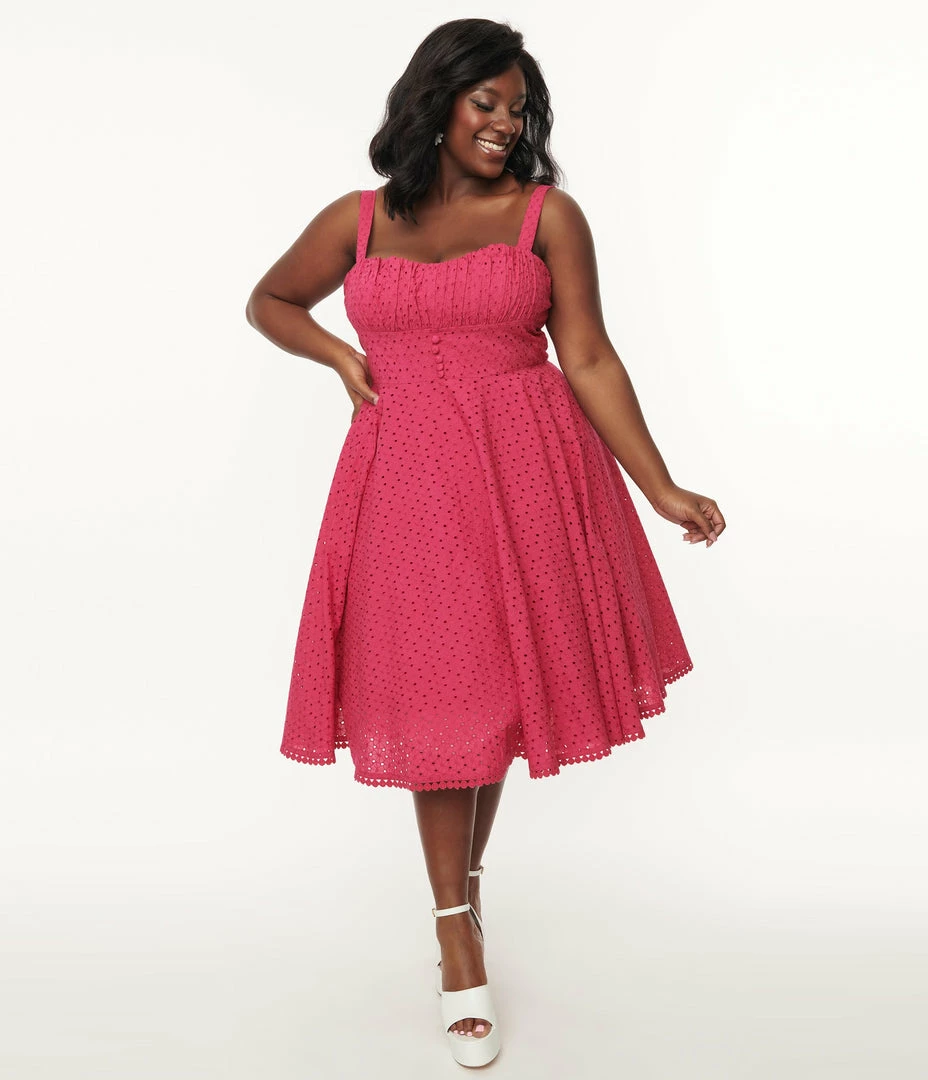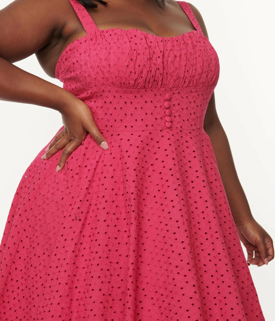 Alluring looks good on you, doll! This graceful plus size dress is a bewitching silhouette of cotton hot pink floral eyelet lace that’s perfect for a frolic through downtown. The soft sweetheart neckline features a gathered bust, supported by button adjustable straps while the wide banded waist elongates and slims your hourglass, complete with darling faux buttons to provide graceful vintage styling. The fabulous swing skirt cascades to a straight hem that swirls round your knees. Outfitted with soft cotton lining and a back zipper to give you a silhouette worthy of romance!Â