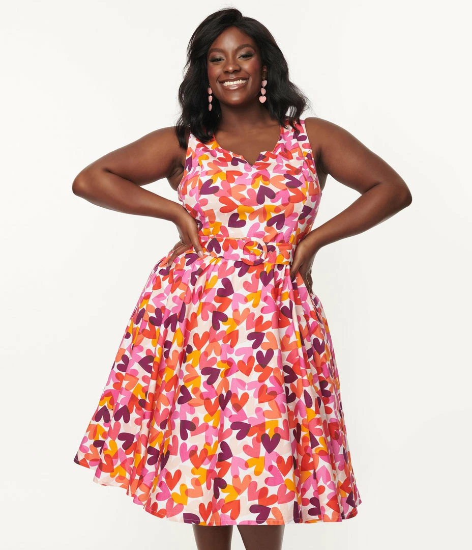 Make their hearts beat faster, darling! This stunning plus size dress is sure to become a staple in any vintage inspired wardrobe, crafted in a marvelous stretch cotton blend that boasts a dazzling all over print of hearts in shades of red, pink, purple, and orange throughout the white backdrop. The princess seamed bodice features a dramatic V notch structured with boning, and framed by the sleeveless silhouette. The fitted high waist is nipped in by the back zipper, and cinched by the matching belt, while the full swing skirt dances at your knees and boasts side pockets for a truly modern touch!