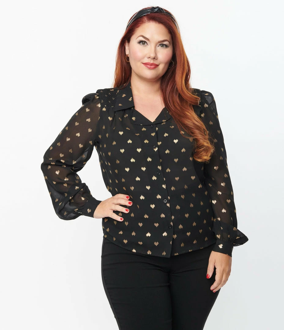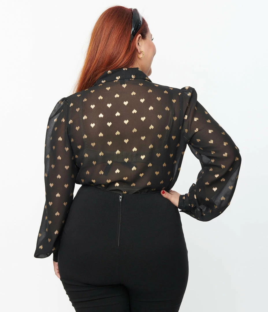 A romantic plus size blouse, crafted in a sheer black crepe that sparkles with a gold foil printed heart pattern throughout. Complete with a button up front and button cuffs