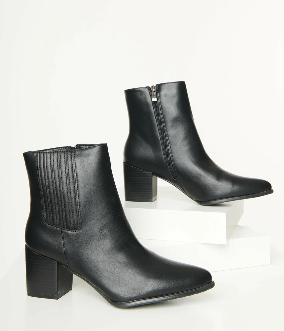 Never miss a chance for some casual fabulousness, gals! Marvelously crafted in gorgeous black leatherette, these 3 inch heel booties are cinched with a side zipper and feature a seamed accent on the side. The pointed toe has you ready to lead the charge!
