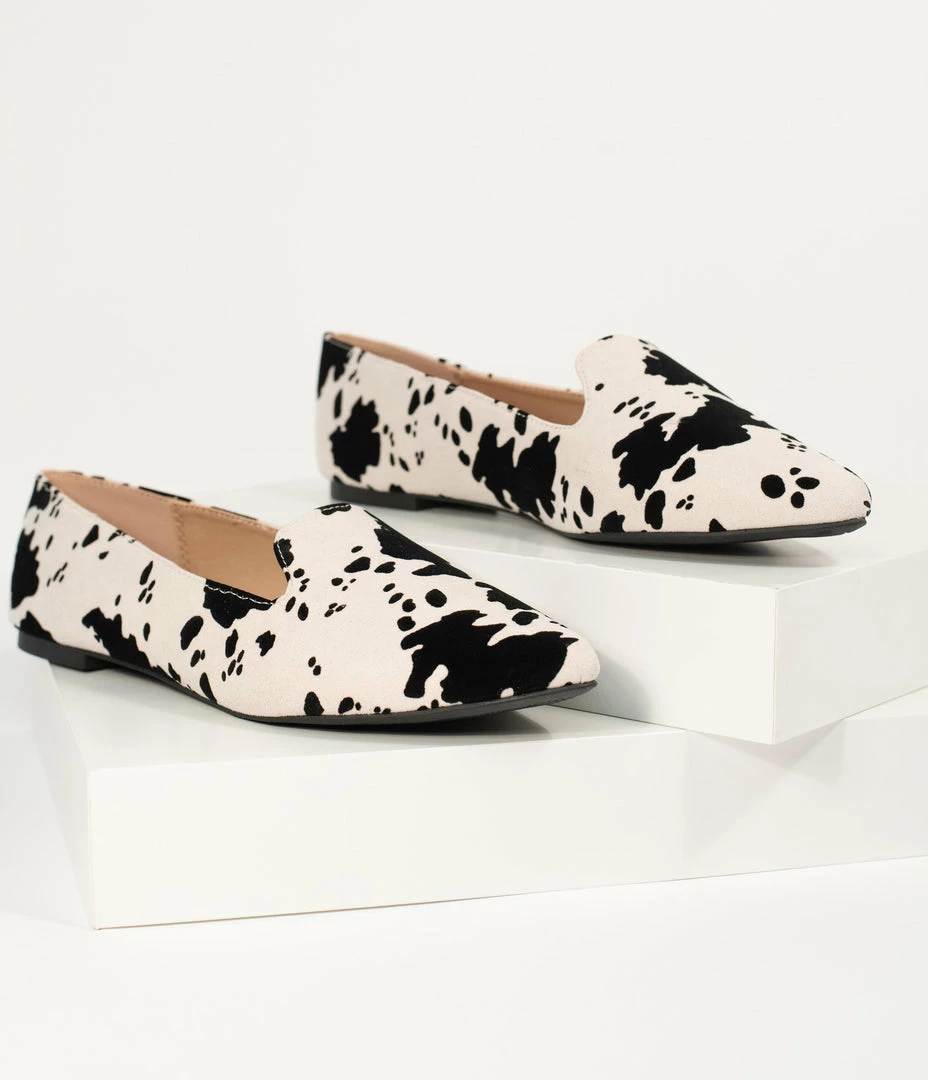 Feel moo-velous with these adorable loafers, crafted in a faux suede and boasting a cute cow print throughout. The pointed toe and slip on style make these an easy addition while the cushion insole keeps you comfortable!