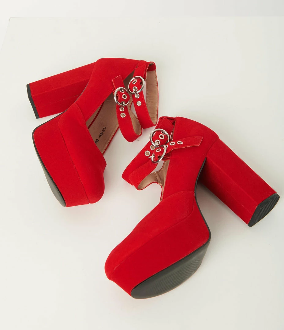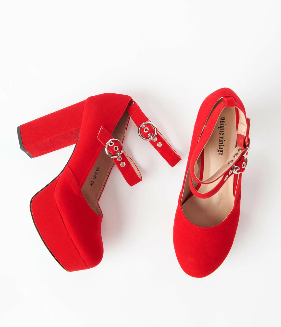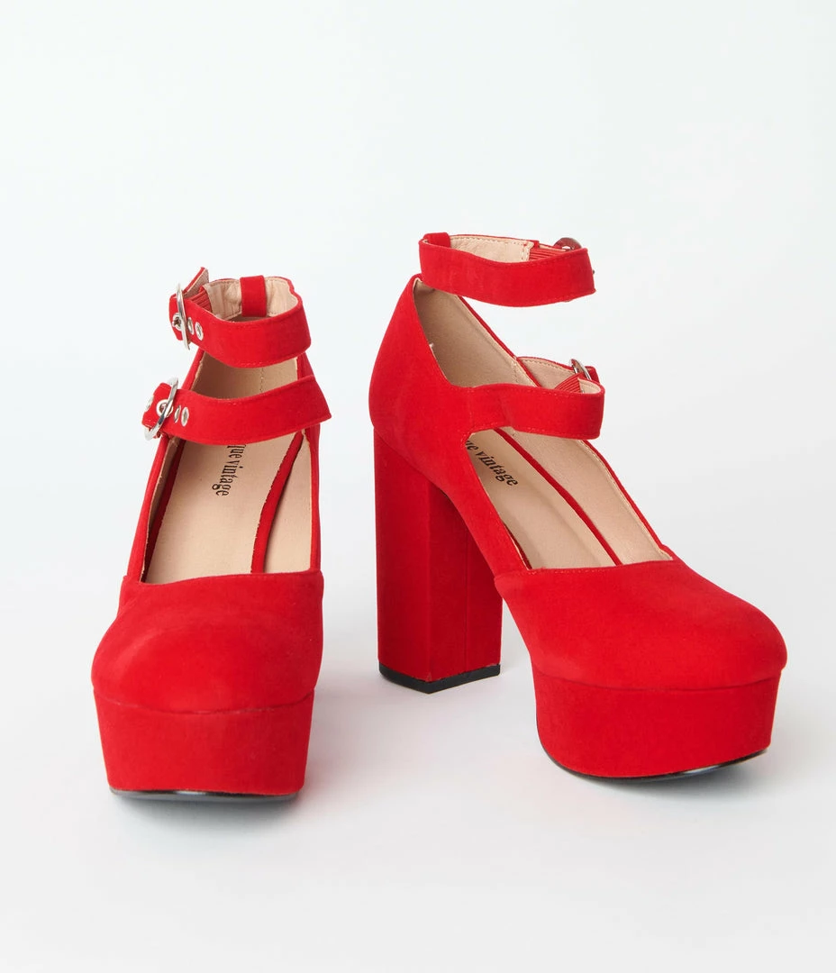 Shoes Unique Vintage Red Suede Double Buckle Platform Heels
