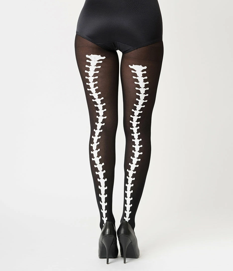 We’ve got your back, dears! Shimmy in to these scary black stockings with white stacked vertebrae for just the right about of fright. Meant for spine-chilling fun!