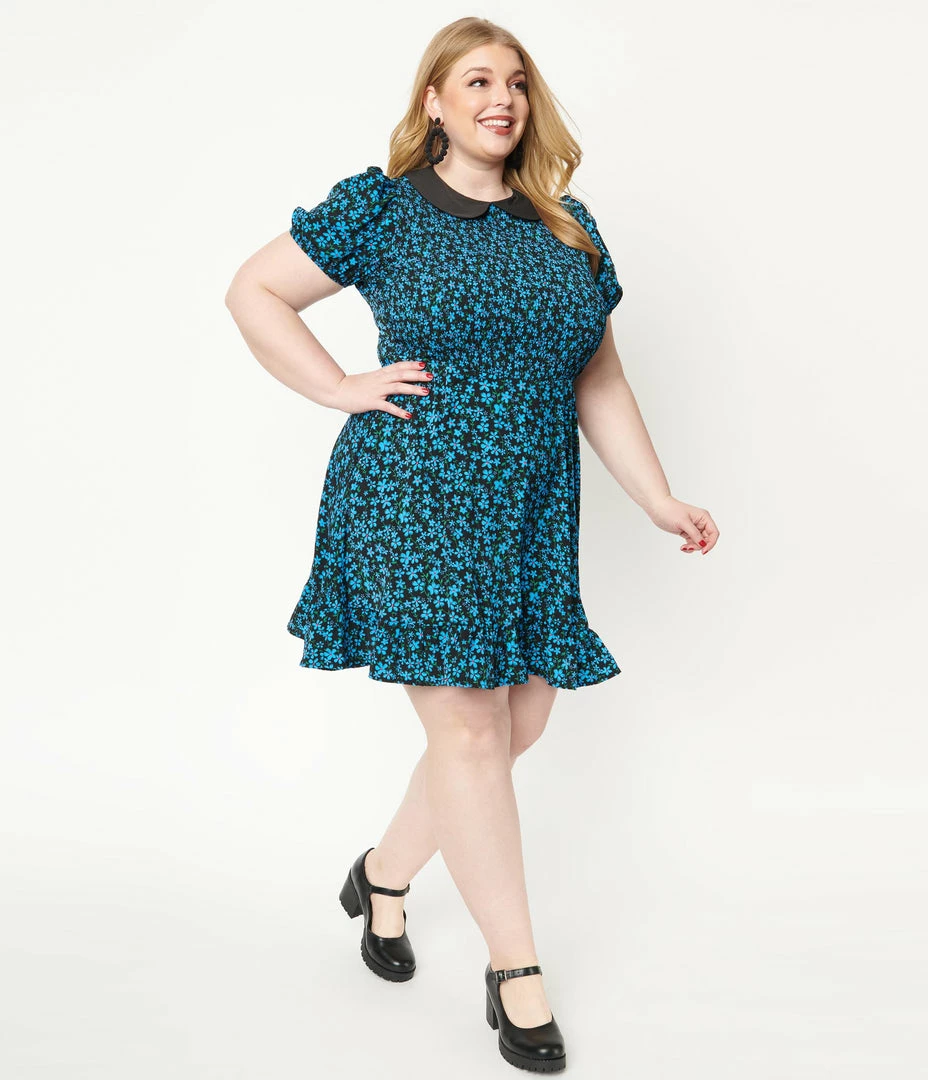 This charming mini dress from Smak Parlour is crafted in a lightweight crepe that dances with blue florals throughout the black backdrop. The smocked bodice flatters your feminine form and is outfitted with an adorable black Peter Pan collar, and framed by sweet short puff sleeves with elastic cuffs. The flare skirts drop from the seamed waist and boast side pockets for a modern touch. Complete with a back zipper to nip you in!