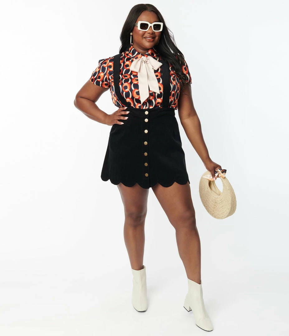 This flirtatious plus size mini skirt is crafted in black corduroy, outfitted with a button up front, removable button adjustable suspender straps, and back pockets!
