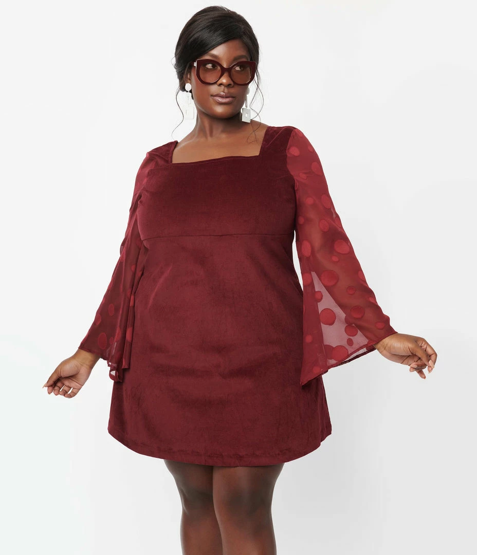 This sweet plus size dress is crafted in a marvelous burgundy corduroy. Boasting a square neckline that is framed by dazzling chiffon bell sleeves accented with floral appliques, while the A-line skirt has side pockets!