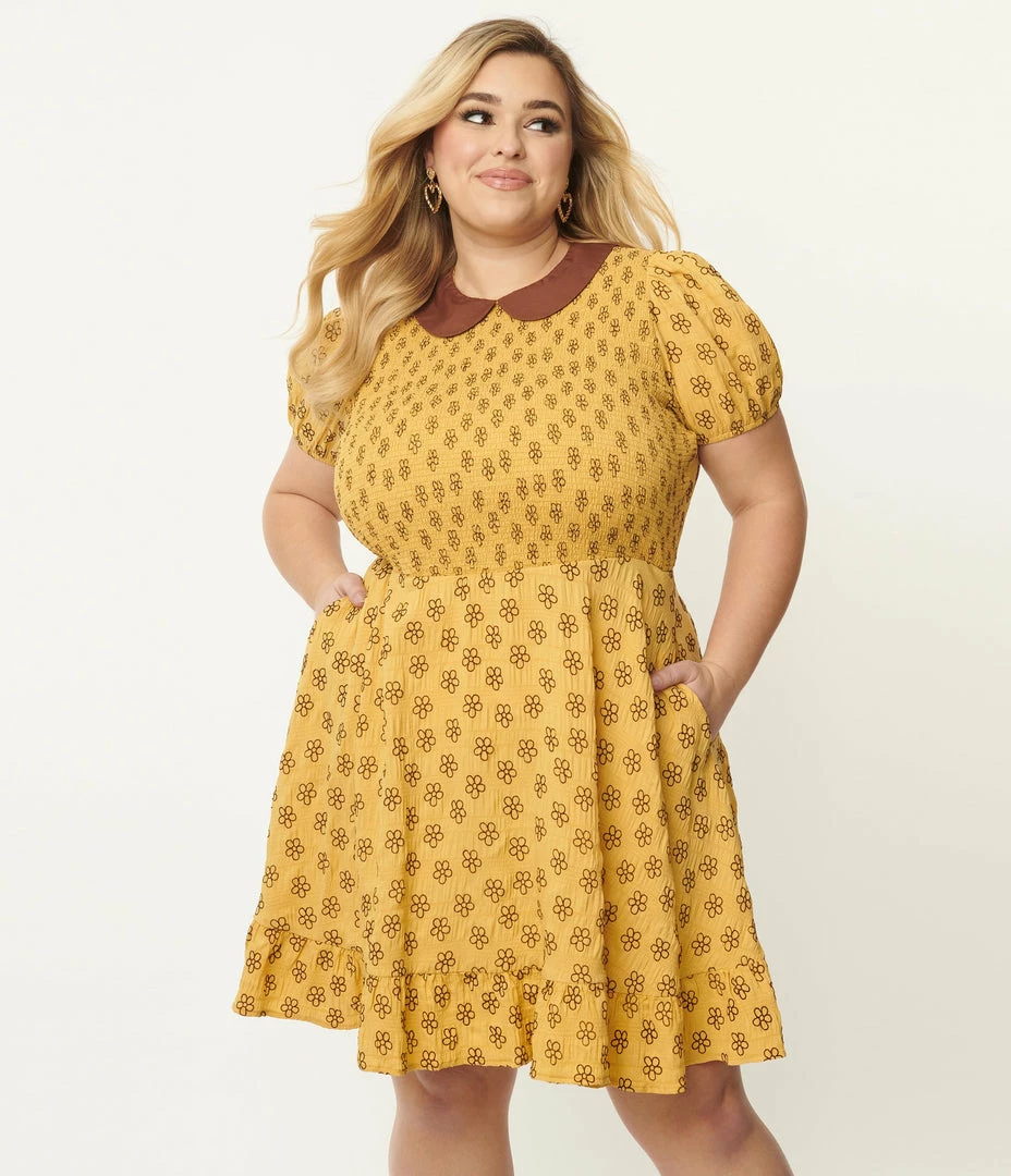 Smak Parlour Plus Size Mustard & Brown Floral Smocked Fit & Flare Dress