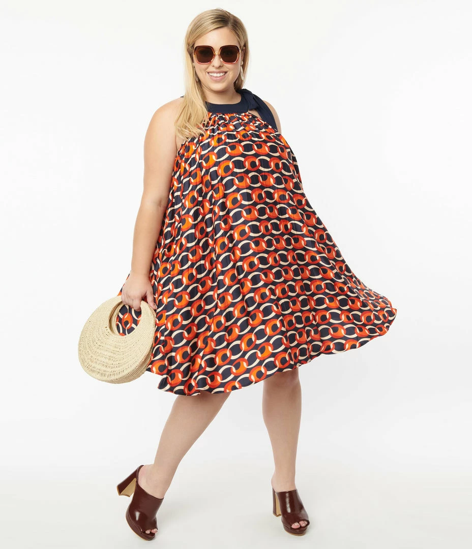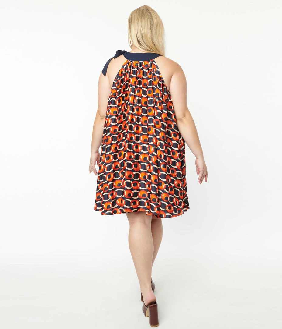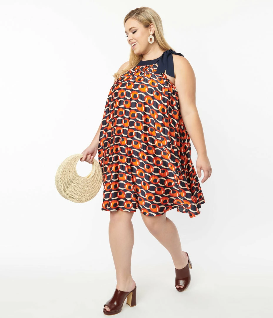 This adorable plus size dress is crafted in a gorgeous satin-like woven fabric that dances with a chain link print in shades of red, beige, and cream throughout the navy blue backdrop. The high neckline is accented with a self tie bow, while the accordion pleated shift dress dances high above the knees!