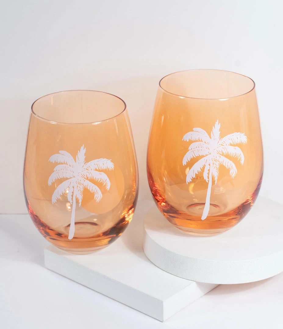 Put together your soiree with these sweet orange cocktail accessories, boasting a stemless style and featuring a gorgeous tropical scene of a setting sun and palm trees throughout the orange glass!