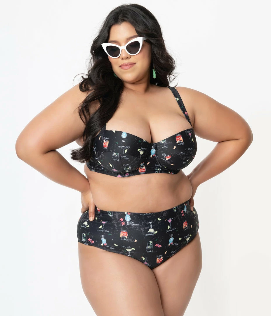 Bring the power of cocktail hour, darling! These plus size retro inspired swim bottoms from Collectif are set with a vibrant print of colorful cocktails throughout a black backdrop. The high waist and modest leg cut are fully mesh lined for comfortable pin-up posing!
