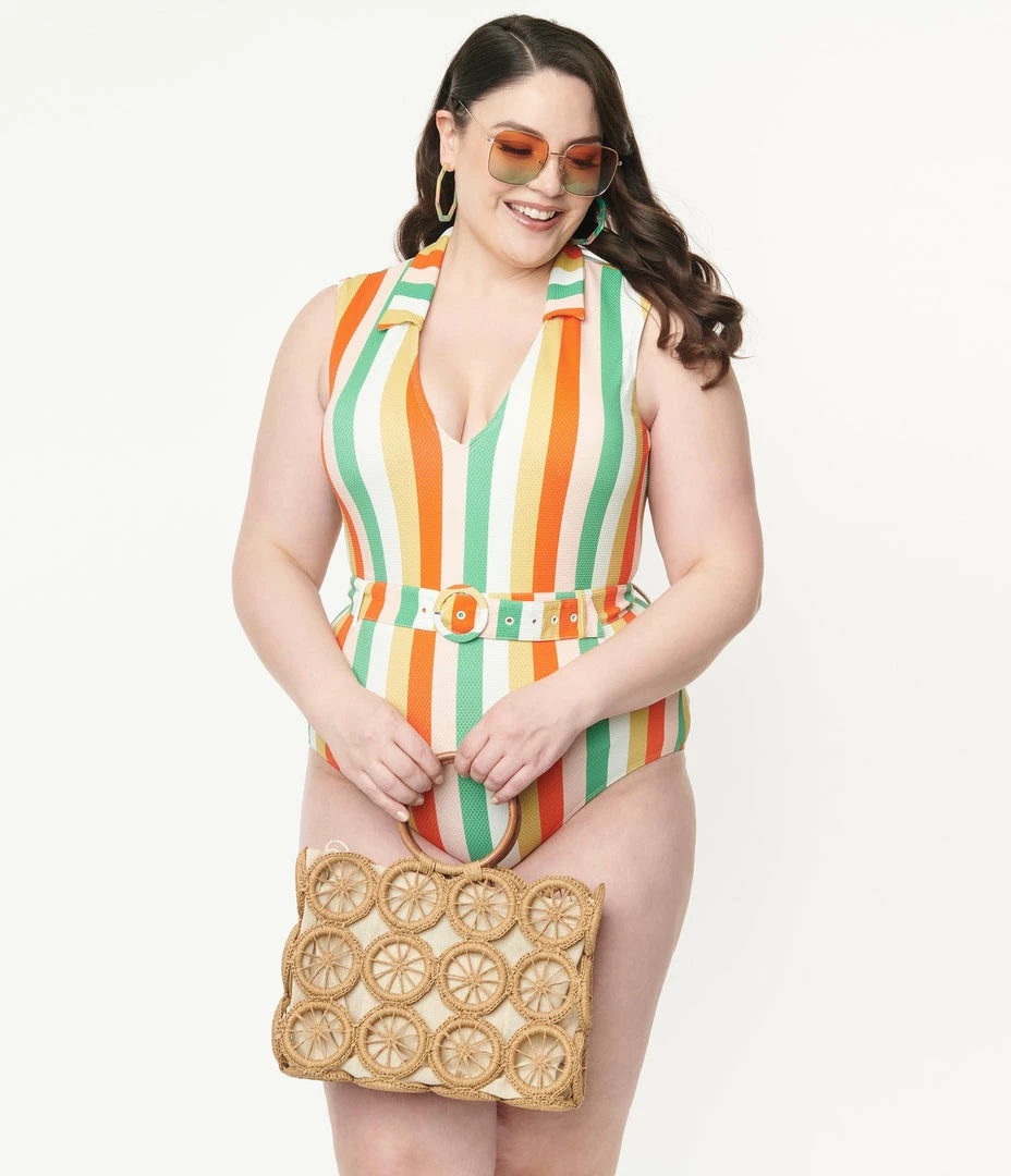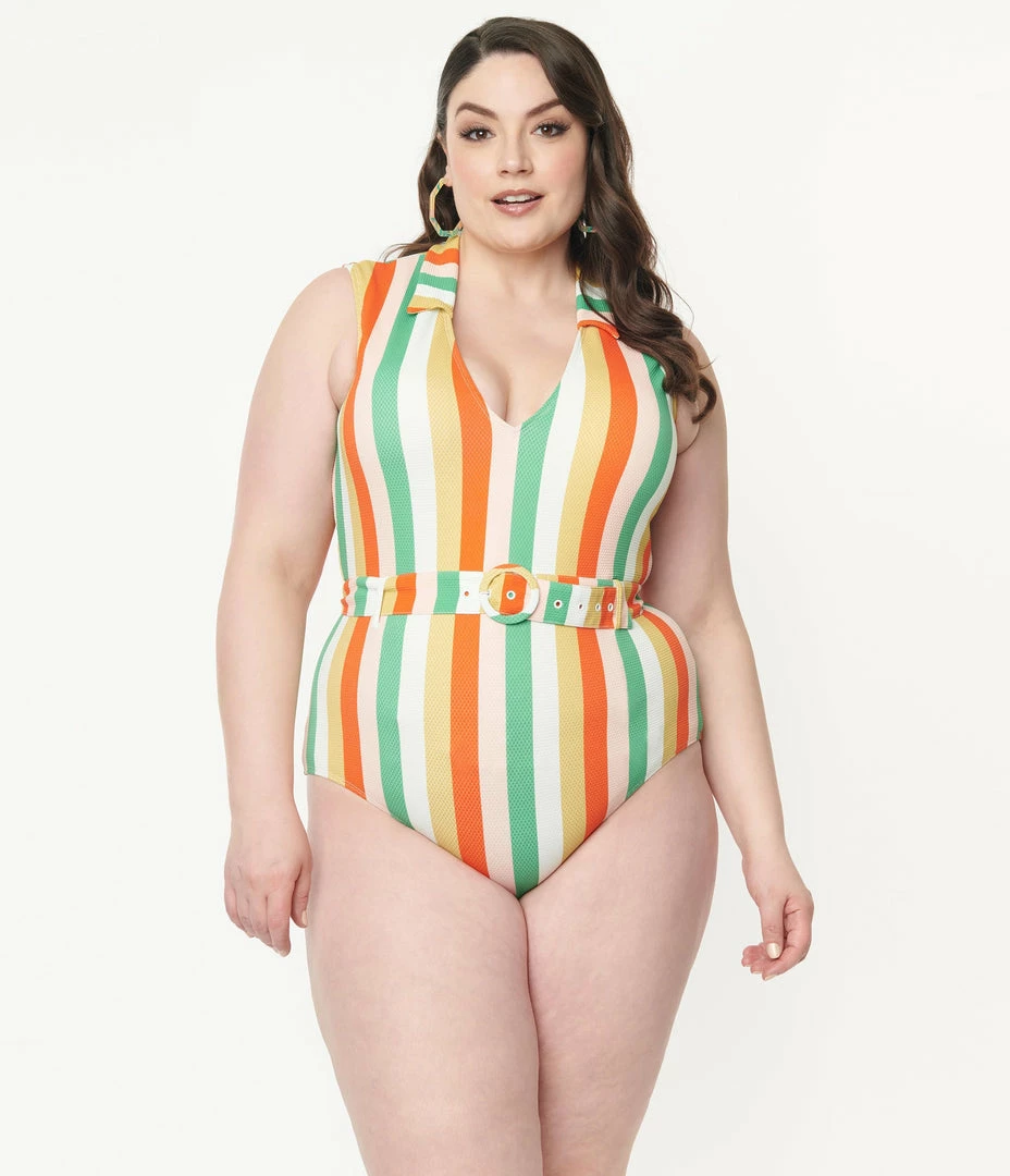 Keep it groovy, baby! Fresh from Kingdom & State, this iconic plus size one piece swimsuit is a fabulous resort ready piece full of sultry pin up vibes. A brilliant pattern of stripes highlight your sexy feminine figure in white, green, orange, and yellow while removable padding and a built in shelf provide a subtle boost. A matching belt embellishes your hourglass while this fully mesh lined bathing suit exudes stunning 1970s memories!